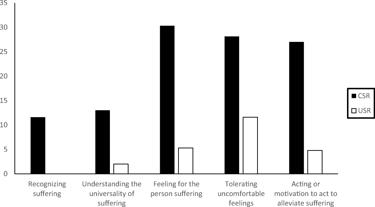 The relation between compassionate and uncompassionate self-responding (CSR and USR) scores of the SCS and elements of self-compassion as measured by the Sussex-Oxford Compassion Scale (SOCS) as expressed in percentages of shared variance (while controlling for the overlap between CSR and USR). The results indicate that CSR is a statistically significantly better indicator of self-compassion elements than USR (all p’s < .001). Analysis conducted on data of the health care staff sample (N = 1158) in the Gu et al. (2020) study