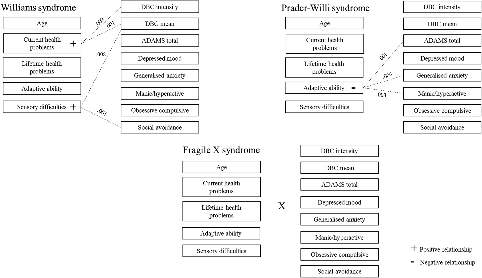 In each of these syndromes there is a heightened risk of developing psychopathology although the types of disorder differ between the groups. Thus, the prevalence of generalised anxiety disorder is high in WS and FXS but not PWS; rates of social anxiety disorder are elevated in FXS but not WS or PWS and there is a higher prevalence of obsessive–compulsive disorder in PWS but not FXS (Cordeiro et al. 2011; Dykens and Shah 2003; Leyfer et al. 2006; Royston et al. 2017). However, the profiles of psychopathology in these syndromes and their correlates have not been compared directly using the same assessments.