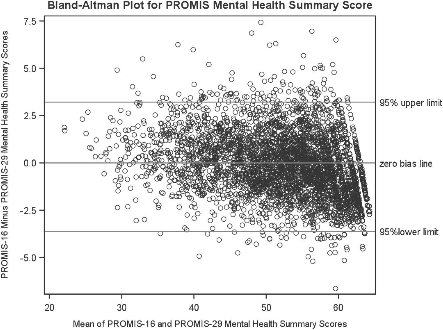 The Bland–Altman plot shows scatter bias for the difference between the PROMIS-16 and PROMIS-29 estimated physical health summary score, with the PROMIS-16 estimates overestimating the PROMIS-29 estimate at the upper (better health) end of the distribution (Fig. 1). Scatterbias is also seen for the PROMIS-29 mental health summary score (Fig. 2), but it is not as large as was seen for the physical health summary score.