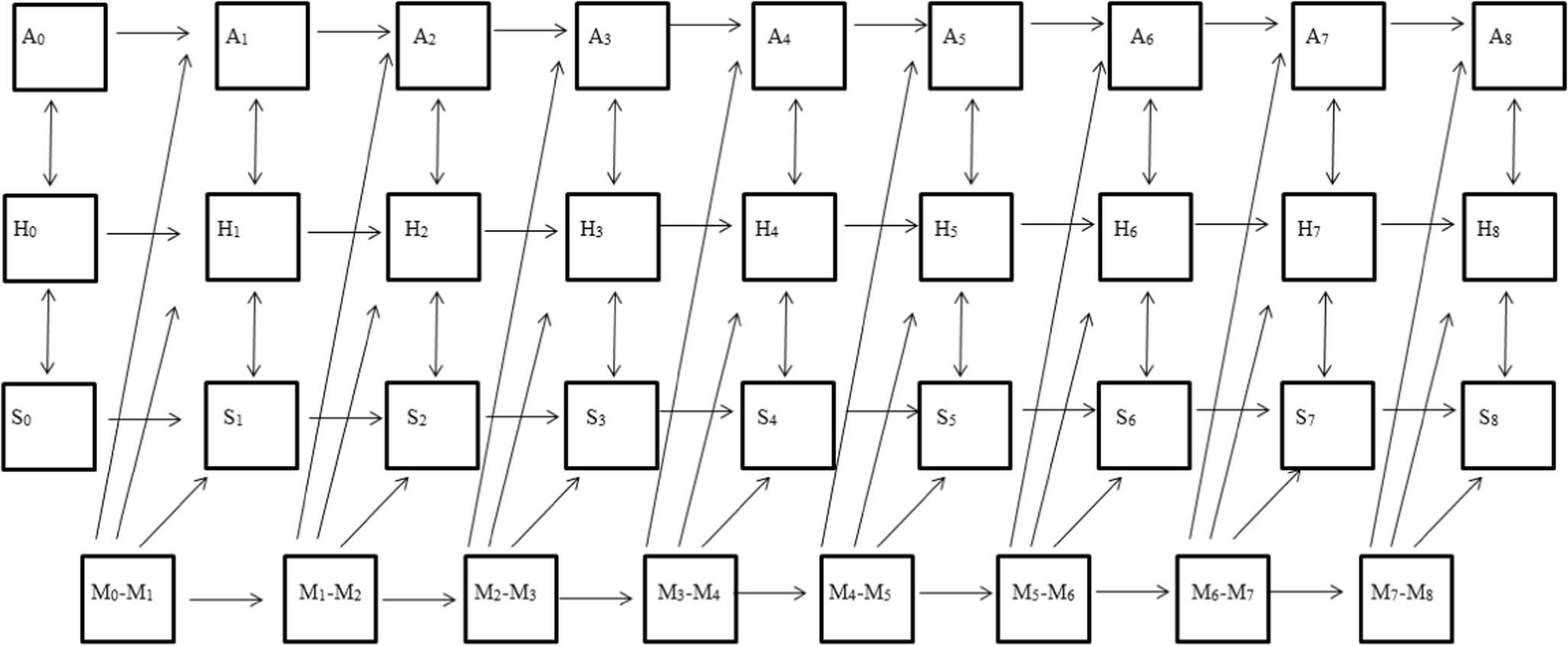Path model for study outcomes (A, anxiety; H, happiness; S, sleep problems) and meditation (M). Subscript numbers denote time points (0 = before program, 8 = after program; e.g., H0, happiness at T0; M2–M3, meditation between T2 and T3)