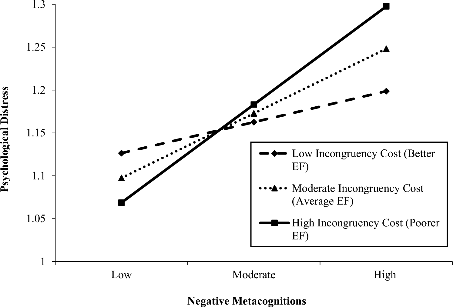 Increased endorsement of metacognitions and poorer executive functioning have been associated with increased adolescent psychological distress. However, it is unknown whether poorer executive functioning strengthens the metacognitions–psychological distress relationship.