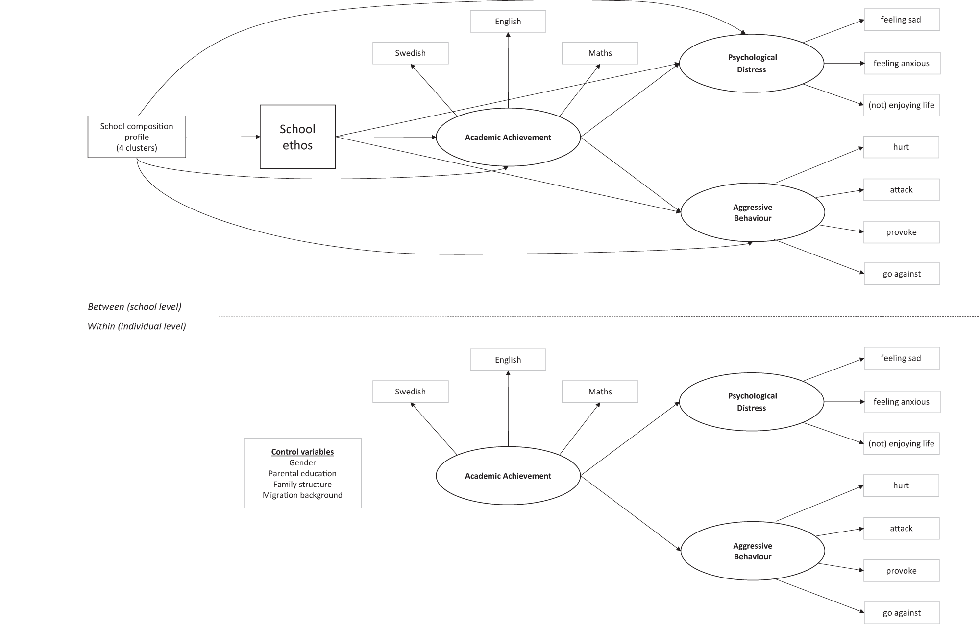 This study aims to examine the role of teacher-rated school ethos for adolescent outcomes, beyond the effects of school and student sociodemographic characteristics. In line with theories of effective schools, the link between school ethos as experienced by teachers and students’ academic achievement will be studied. The effective schools literature will also be extended to adolescent well-being by conceptualising school as students’ work environment and main social context, and by exploring the role of school ethos in students’ psychological distress and aggressive behaviour. Multilevel structural equation modelling (ML-SEM) will be used to distinguish between individual versus school components of these associations. The effects of school ethos on student outcomes are examined at the school level, while the associations between academic achievement, psychological distress and aggressive behaviour are simultaneously estimated at the individual and school levels. Figure 1 illustrates the proposed model.