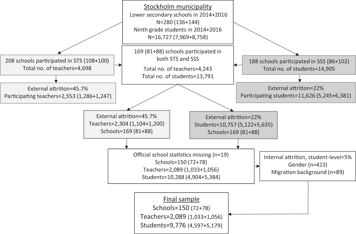 The Stockholm Teacher Survey (STS) was sent to all teachers working in the lower secondary schools participating in the SSS. Teachers completed a web-based questionnaire taking 15–20 min and were compensated with a gift certificate worth 100 SEK. Altogether, the combined teacher–student data covers 169 lower secondary school units, with a response rate of 78% for grade 9 students to the SSS (n = 10,757), and 54.3% for teachers to the STS (n = 2304).