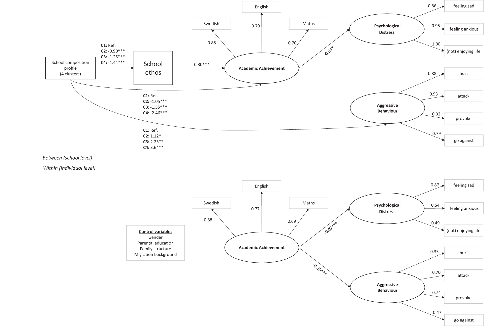 A high-quality educational and social school environment can promote adolescents’ school performance but also their concurrent and future psychological well-being (Ahrén 2010; PHAS 2018a, 2018b). As school-contextual characteristics are potentially alterable through effective management and constructive educational policies, it is critical to identify links between effective school features and student outcomes. School ethos defined as a measure of a school’s purposeful efforts to develop the learning environment and relationships between staff and students has the potential to promote both students’ academic achievement (Jacobson 2011) and reduce poor psychological well-being (Aldridge and McChesney 2018). Thus, strengthening the school’s ethos could particularly benefit more sociodemographically disadvantaged schools attempting to compensate for students’ family background. Through multilevel structural equation modeling, the current study examined the role of teacher-rated school ethos in relation to students’ academic achievement as well as internalising and externalising manifestations of poor psychological well-being, taking school student body composition into account.