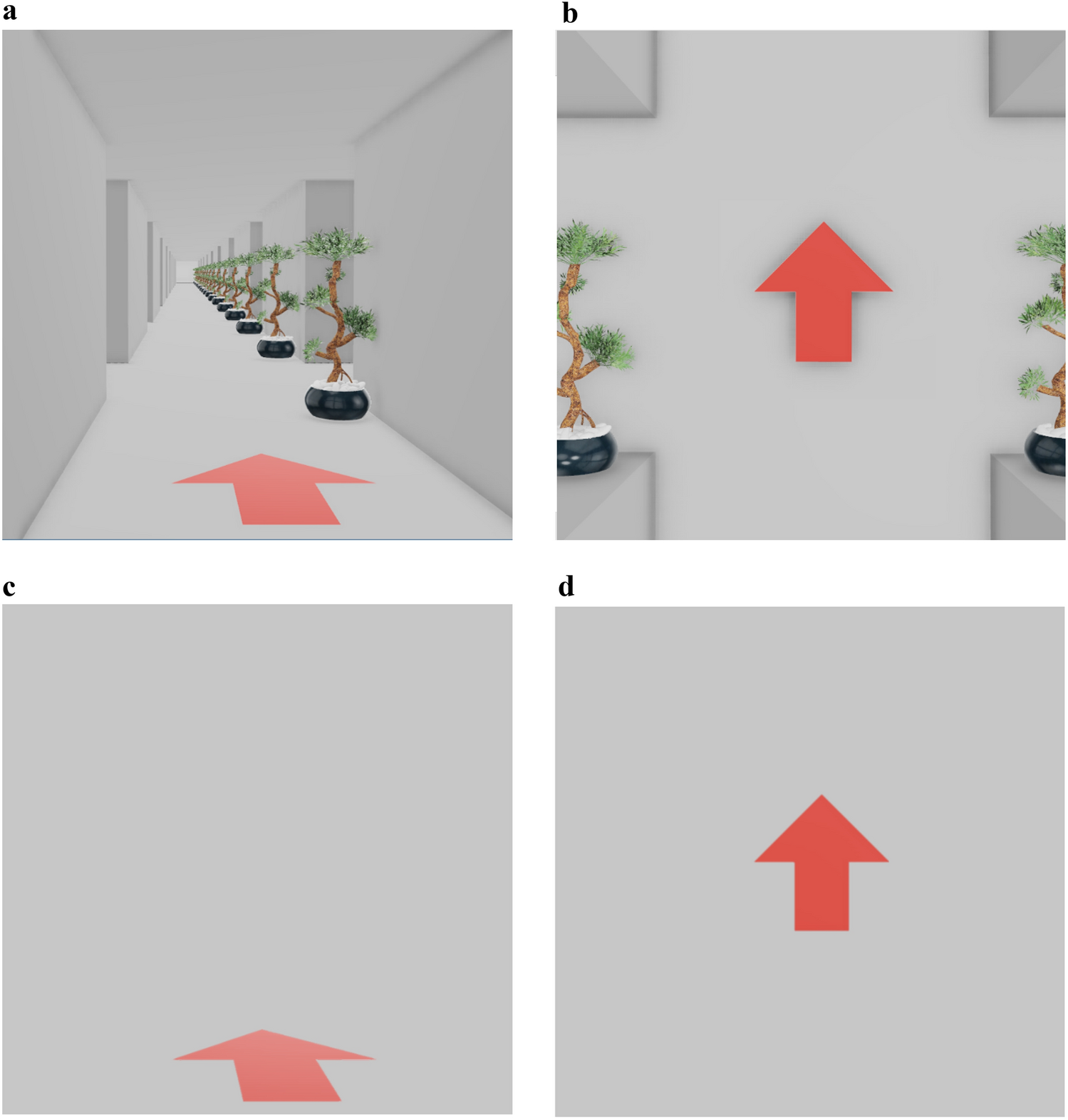 Participants sat in front of a 19″ computer monitor on which a sequence of 12 red arrows was displayed. The sequence was presented either in a horizontal plane, with arrows pointing forwards, backwards, left- or rightwards, or in a vertical plane, with arrows pointing upwards, downwards, left- or rightwards. The sequence was displayed either at the intersections of a maze that was oriented in the same plane as the arrow sequence (i.e., vertically or horizontally) or against a featureless background. The images that constituted the maze were implemented by the architecture design software pCon planner. Images were quadratic with a side length of 870 pixels and displayed at the screen center in their actual size with the remaining screen surface in black. The whole experiment was run in PsychoPy, version v2021.2.3 (Peirce et al., 2019). Figure 1 illustrates a forward-pointing arrow in a horizontal maze (Fig. 1a), a forward-pointing arrow without a maze context (Fig. 1c), an upward-pointing arrow in a vertical maze (Fig. 1b), and an upward-pointing arrow without a maze context (Fig. 1d). Note that the arrows for the horizontal maze were presented near the bottom of the image because this is where people usually look when walking, but we expected no consequences of this for the learning process.
