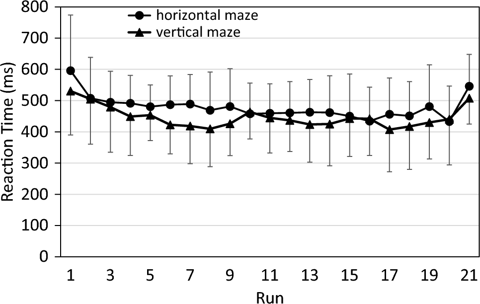 To assess the general benefits of practice, we compared participants’ performance across the 20 practice runs by analyses of variance (ANOVAs). RT was the dependent variable in one ANOVA, and CS was the dependent variable in another ANOVA. Context and Run served as independent variables with repeated measures in both ANOVAs. The levels of Context were ‘horizontal’ and ‘vertical’ in the pilot study, and were ‘with maze’ and ‘without maze’ in the main study. The levels of Run were 1, 2, …, 20 in both studies.