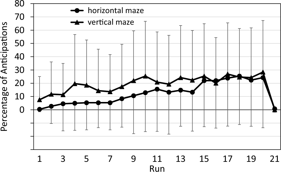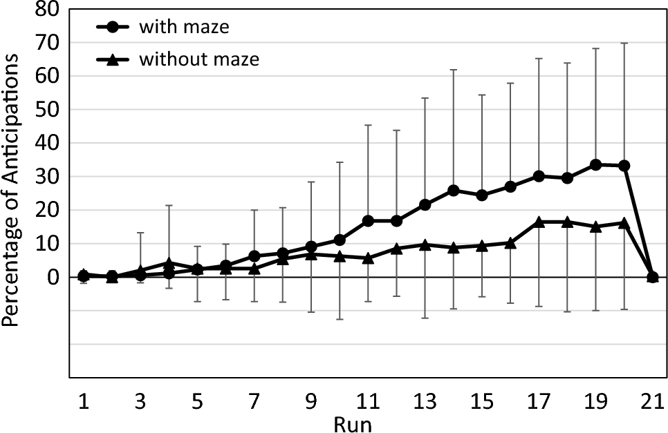 Percentage of anticipations across runs in both maze contexts of the pilot study. Error bars represent standard deviations