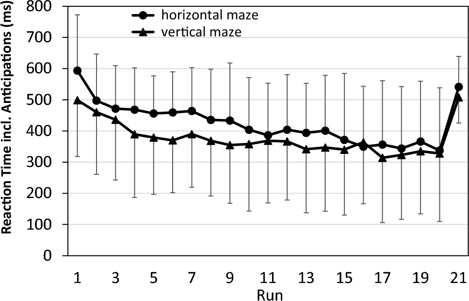 In a pilot study, we first established our experimental sequence-learning paradigm as a SRT task embedded in a maze context. To this end, we compared participants’ RTs in a horizontally oriented maze to those in a vertically oriented maze. The sequence of arrows and manual responses was the same in both learning conditions, but the behavioral context was different. We assessed learning in two ways. First, we examined general practice benefits across twenty practice runs of 12 arrows each. Then, we tested sequence-specific learning by comparing performance in the last practice run (Run 20) with a new transfer sequence in the following run (Run 21), so that any sequence-specific learning can no longer be applied and any performance decrement would indicate learning beyond unspecific practice with the task and response device.