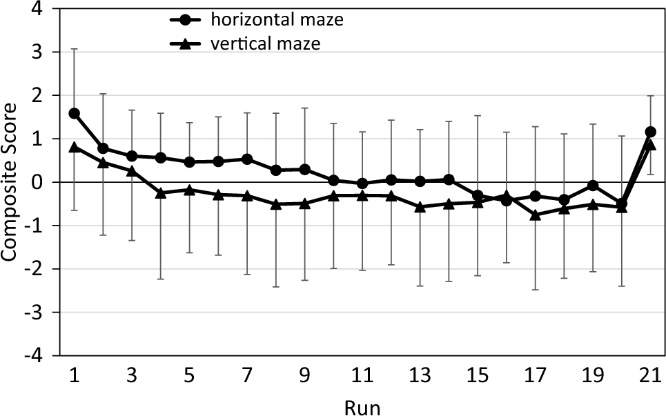 Figure 5 depicts the pattern of CS scores. The pattern is quite similar to that in Fig. 4, except that the difference between the two maze contexts now is even more pronounced. An ANOVA of practice benefits yielded a significant effect not only of Run (F(19,437) = 13.08; p < 0.001; partial η2 = 0.36), but also of Context (F(1,23) = 6.86; p = 0.015; partial η2 = 0.23): CS was lower with the vertical than with the horizontal maze. The interaction of Run and Context was not significant (F(19,437) = 1.35; p = 0.148; partial η2 = 0.06). An ANOVA of sequence-specific learning again yielded a significant effect of Run (F(1,23) = 24.27; p < 0.001; partial η2 = 0.51). However, both the main effect of Context (F(1,23) = 1.79; p = 0.193; partial η2 = 0.07) and the interaction of Run and Context was not significant (F(1,23) = 0.62; p = 0.440; partial η2 = 0.03).