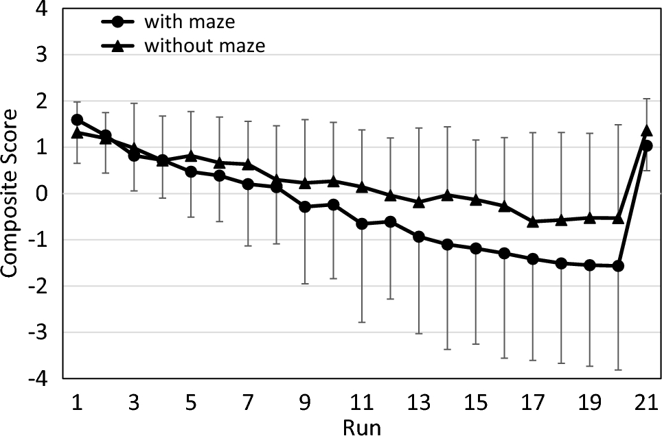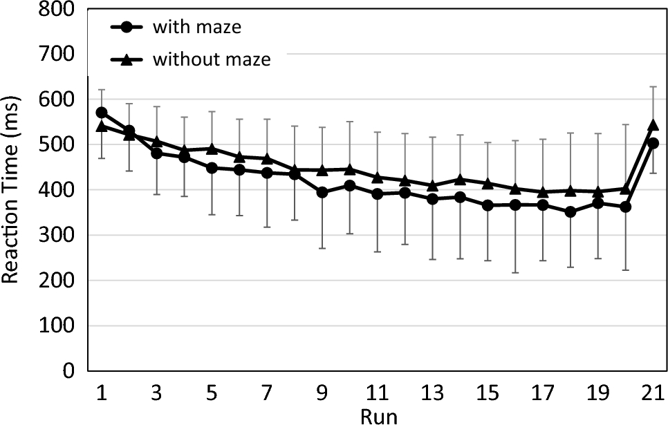 Response errors occurred in only 0.68% of responses and their incidence did not differ with vs. without the maze in a test of proportions (p = 0.566). As in the pilot study, RT decreased from the first to the last practice run and increased again in the transfer run, as shown in Fig. 6.