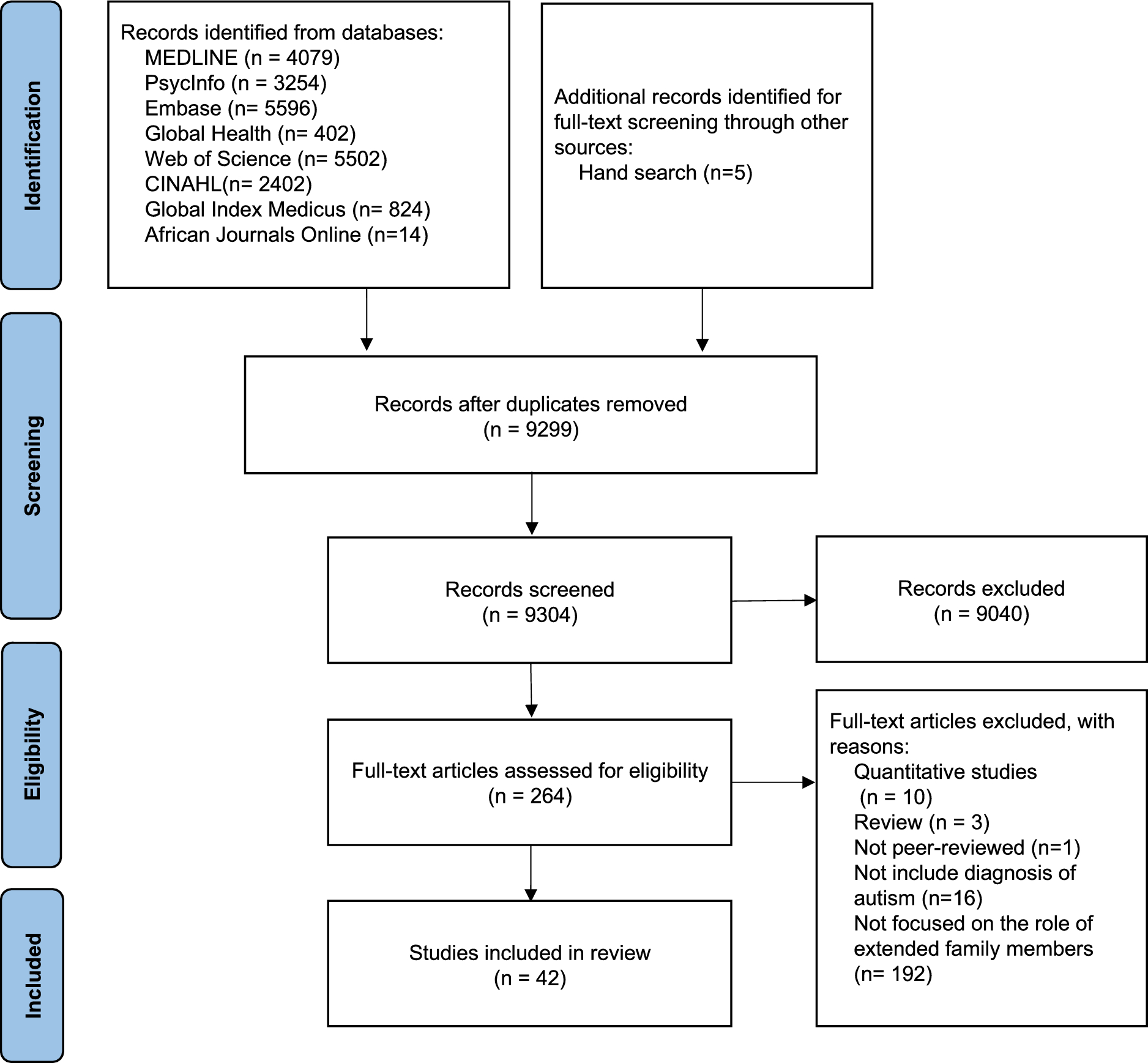 Primary research studies using qualitative methods to explore the perspectives of the role of extended family members within the families of autistic individuals were sought. We focussed on synthesising qualitative studies as this allows for an in-depth, nuanced understanding of participants’ lived experiences and helps identify themes across different countries and stakeholder groups (Thomas & Harden, 2008). This level of detail is often not captured in quantitative research. We included the studies focussed on autistic individuals of all ages, and studies centred around a wider range of developmental disabilities with at least some of individuals having a diagnosis of autism.