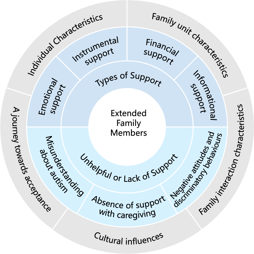 In 39 of the studies, extended family members were highly involved and provided various kinds of support to autistic individuals and their parents. These could be categorised into four types: emotional support, instrumental support, financial support, and informational support.
