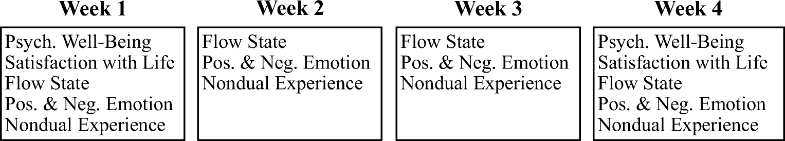Weeks 1 and 4 both included the Psychological Well-Being Scale (Ryff & Keyes, 1995), the Satisfaction with Life Scale (Diener et al., 1985), the Flow State Scale (Jackson & Marsh, 1996), the Nondual Awareness Dimensional Assessment (Hanley et al., 2018), and the Positive and Negative Affect Scale (Watson et al., 1988). Weeks 2 and 3 only included the Flow State Scale (Jackson & Marsh, 1996), Nondual Awareness Dimensional Assessment (Hanley et al., 2018), and the Positive and Negative Affect Scale (Watson et al., 1988). See Fig. 1 for a flow chart of the study procedure.