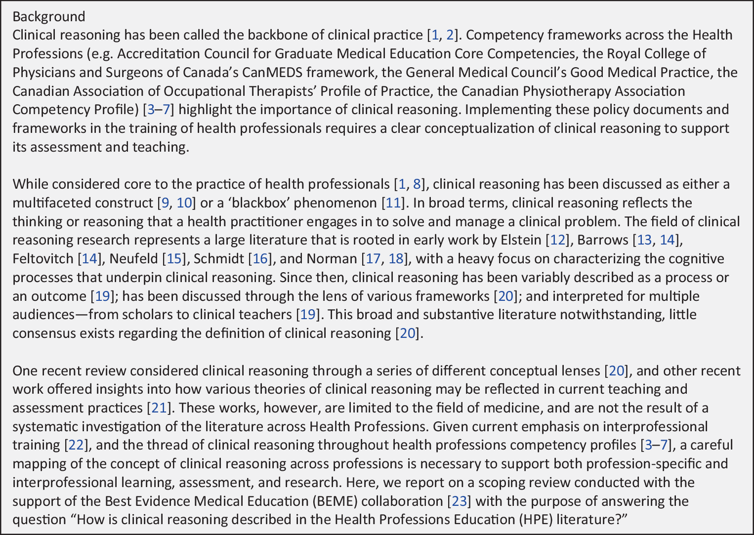 If yours is the first review of the concept with reference to the particular context and participants you’ve outlined, you can simply say so, as Shorey et al. [17] do with their assertion that “there are no existing reviews that have consolidated evidence from studies across all medical faculties” (p 767). However, if the literature has already been reviewed, your effort to justify the need for your review needs a bit more attention. Young et al.’s third introductory paragraph recognizes the existence of other reviews and conceptual analyses of clinical reasoning, points out their “limited” focus on medicine, and argues for the need for a synthesis of “literature across Health Professions”. This justification is followed by a positive Hook that labels what’s distinctive about their review: “a careful mapping of the concept of clinical reasoning across professions is necessary to support both profession-specific and interprofessional learning, assessment, and research.”