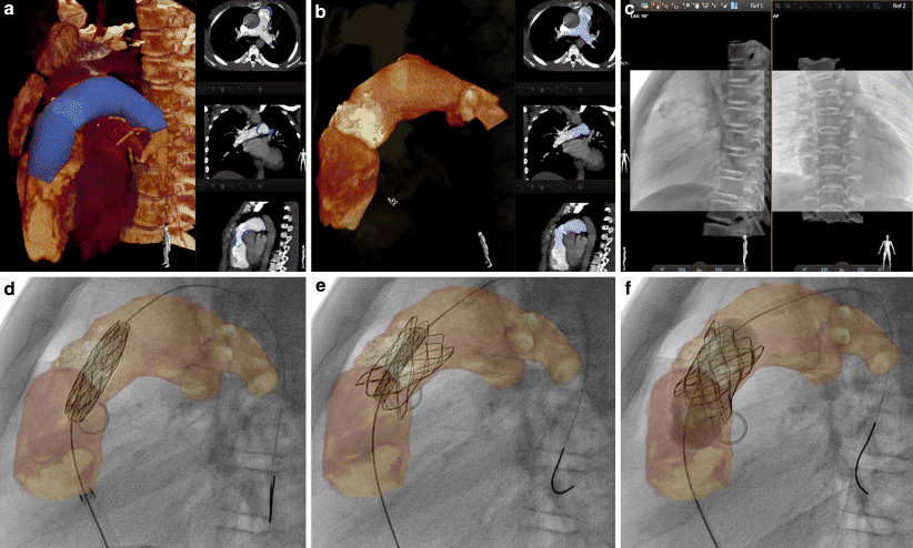 VesselNavigator assisted percutaneous pulmonary valve implantation. Automatic three-dimensional (3D) reconstruction (a, left panel) and row scans (right panels) from pre-registered computed tomography were manipulated to outline the conduit and the proximal pulmonary arteries (b). In addition to bony structures, heavy conduit calcifications were utilised to enhance manual 3D image fusion with live fluoroscopy (c). The 3D roadmap was utilised to guide creation of the landing zone (d) and subsequent implantation (e, f) of a Melody valve (Medtronic Inc.)