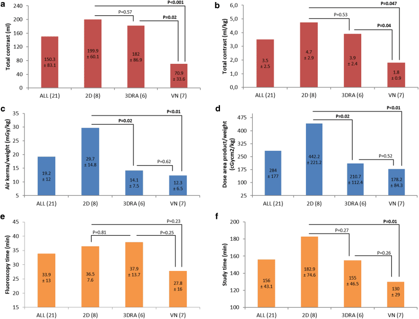Comparison of absolute (a) and weight adjusted (b) contrast usage, weight adjusted air kerma (c) and dose area product (d), fluoroscopy (e) and study times (f) between two-dimensional angiography (2DA), three-dimensional rotational angiography (3DRA) and VesselNavigator (VN) guided percutaneous pulmonary valve implantation