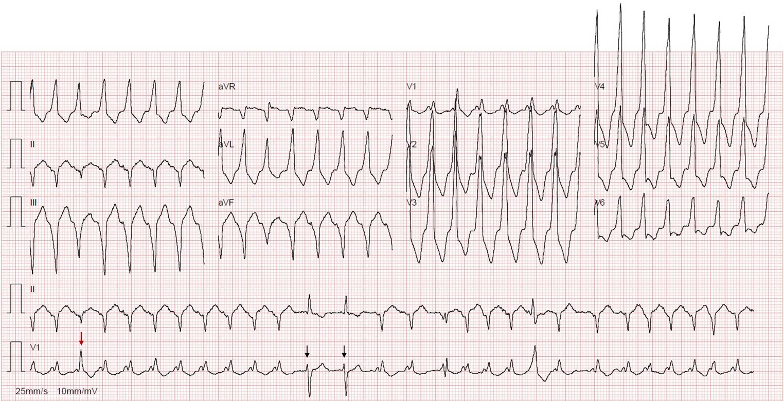 Atrial fibrillation with both pre-excited and non-pre-excited QRS complexes. Red arrow—fusion complex, combining AV nodal and accessory pathway conduction; black arrows—atrial fibrillation beats conducted via the AV node, without preexcitation
