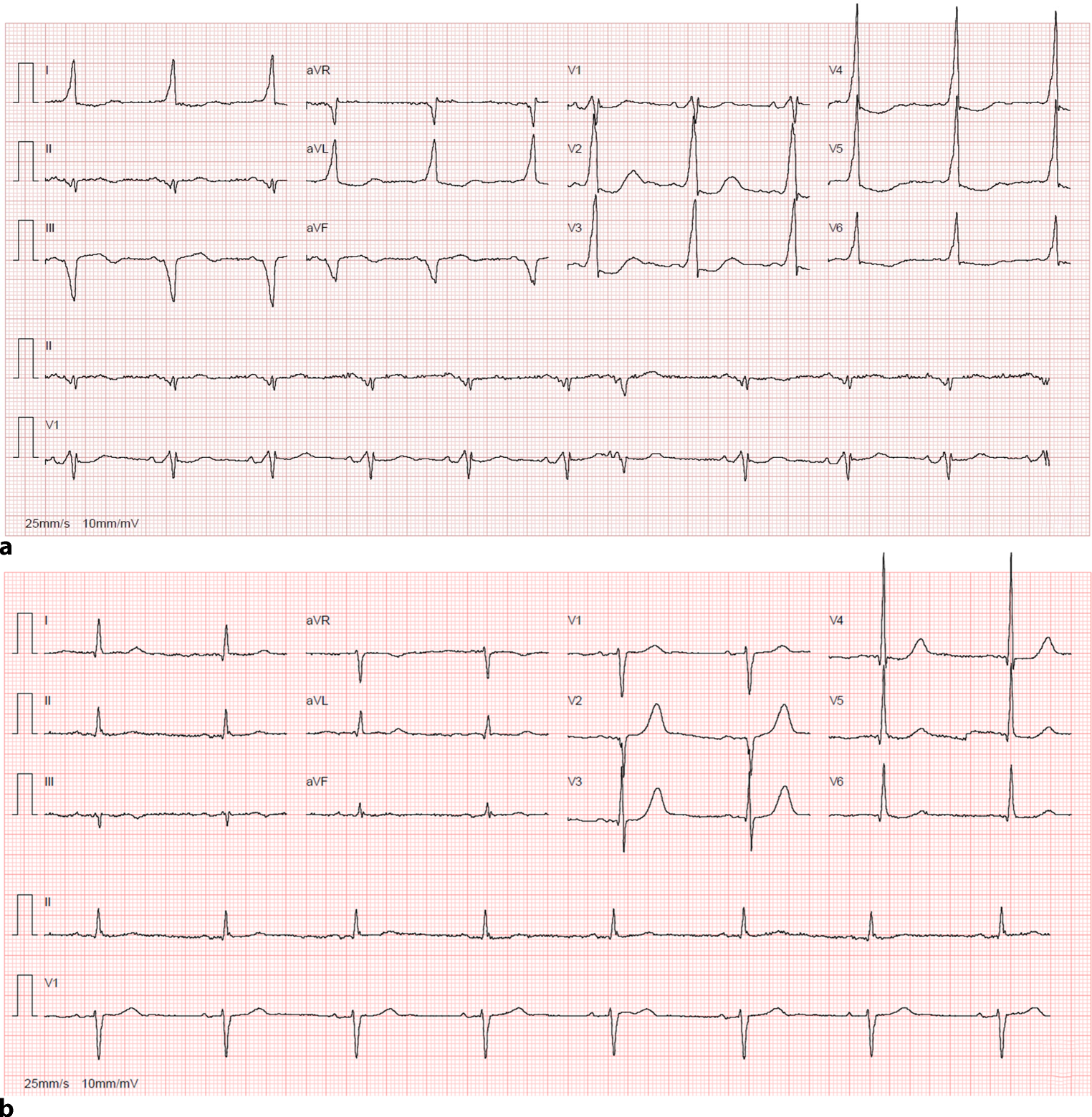 a Sinus rhythm after boluses of flecainide and metoprolol, with pre-excitation pattern; b Sinus rhythm with normal atrioventricular conduction after catheter ablation