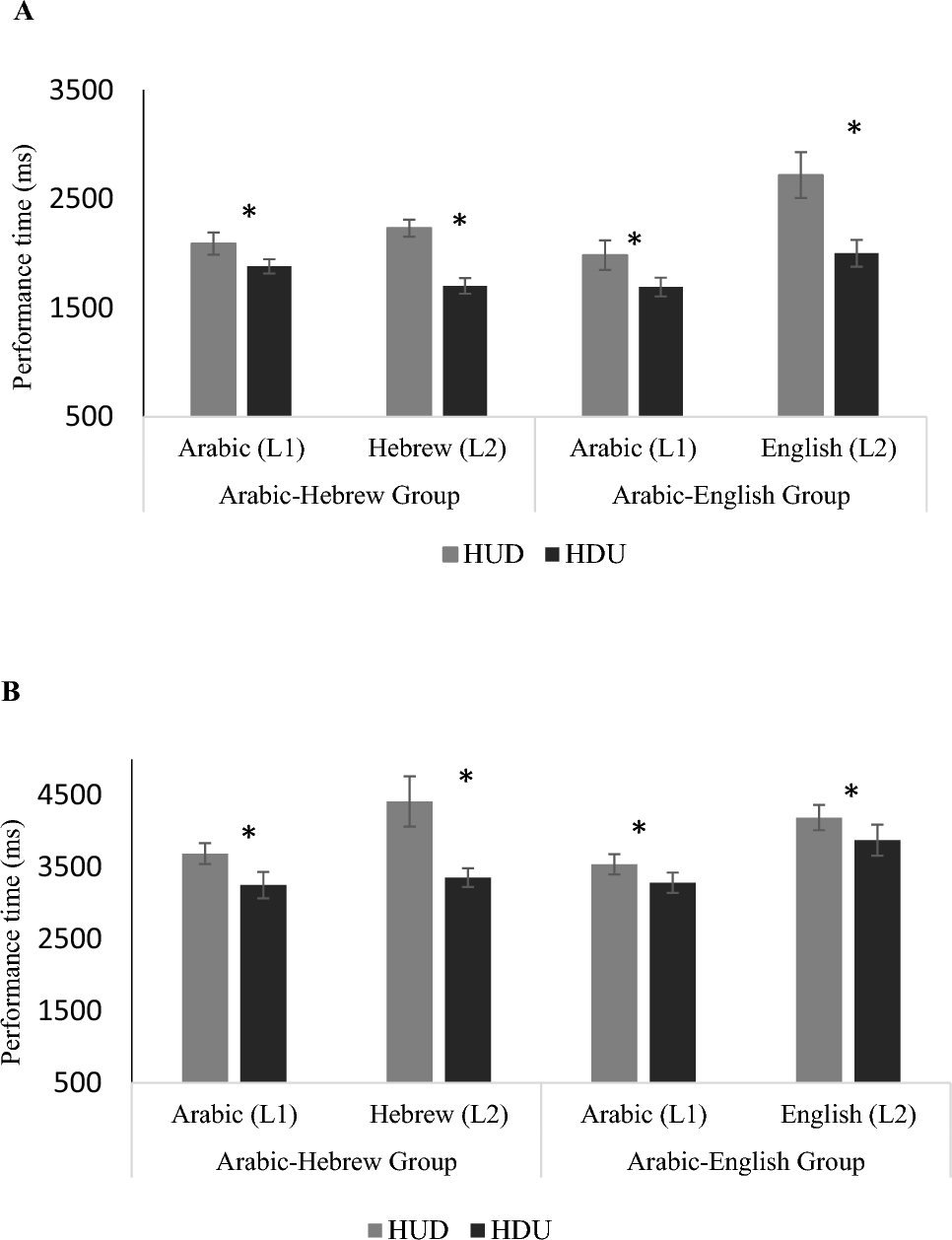 Means and SDs of performance time among native speakers of Arabic in the auditory (panel A) and visual (panel B) conditions. HUD hundreds, units followed by decade (the standard in Arabic); HDU hundreds, decades, units (the standard in Hebrew and English)