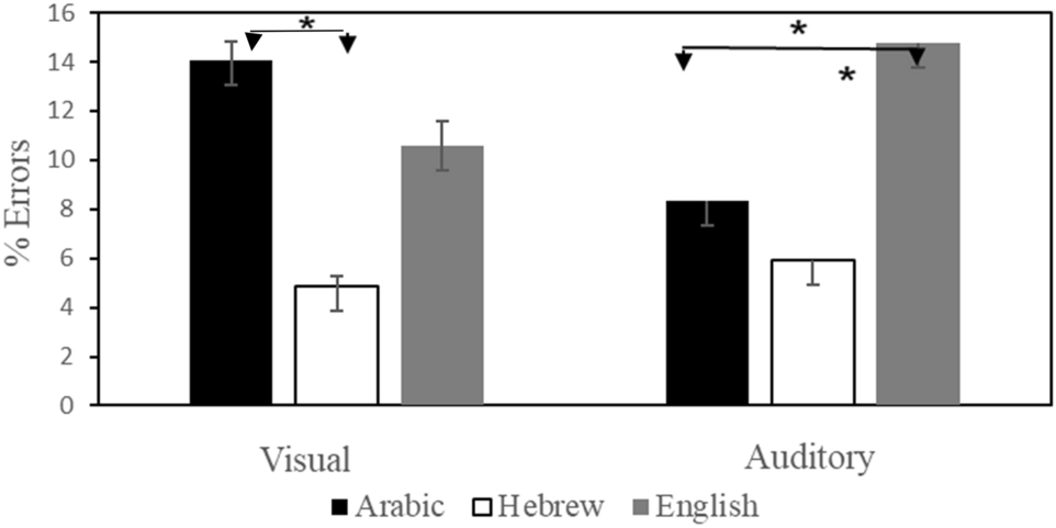 Percentage of errors (standard errors) for native speakers of Arabic in Arabic, Hebrew and English for the auditory and visual modality