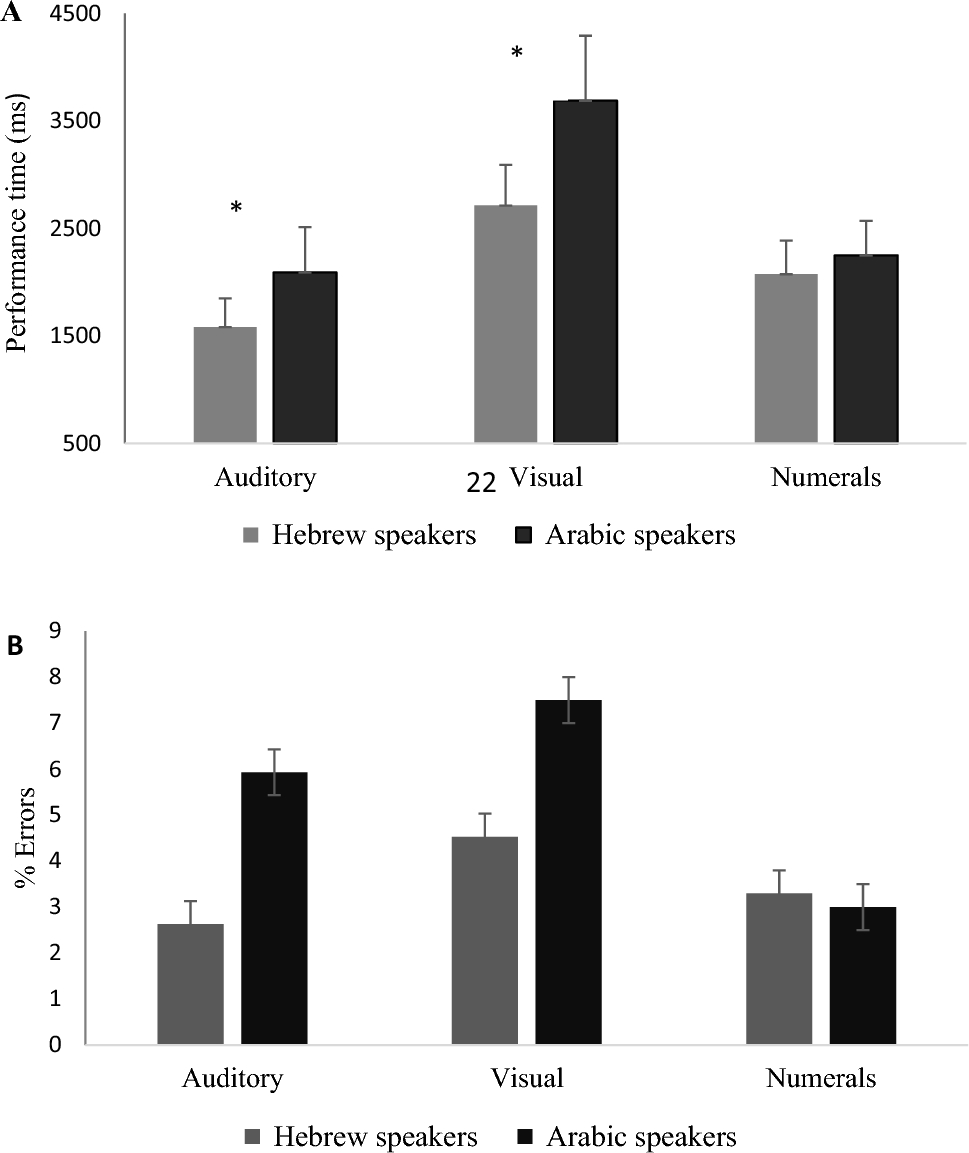 Performance time (Panel A) and percentage of errors (Panel B) in the participant’s native language for Arabic and Hebrew speakers in the two visual (numerals, number words) and the auditory condition