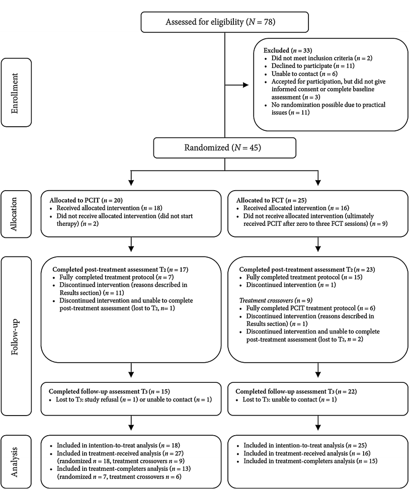 Of the participating children (N = 45), the largest group (42.2 %) were referred by another child mental health service. Twelve families (26.7 %) were referred by child protection services, eight families (17.8 %) were internal referrals from other departments of the community mental health center, and six families (13.3 %) were referred by a general practitioner. After informed consent, families were initially assigned to PCIT (n = 20) or FCT (n = 25) using an allocation ratio of 1:1, including block randomization stratified by child age and gender (Fig. 1). Two families allocated to PCIT did not begin therapy; one of these moved to another city after inclusion, and in the other family significant signs of sexual abuse emerged. Sexual abuse is not typically a contraindication for PCIT, unless the parent participating in treatment is thought to be the perpetrator, which was the case in this family. Nine families initially allocated to FCT were transferred to PCIT after zero to three FCT sessions. In six of those cases, the parents or the referring counselor disagreed with the randomization outcome. The other three families crossed over after clinical judgment by the family creative therapist; in two such cases, working with constructive materials seemed inappropriate given the severity of the child’s behavior problems; the other child was very young, 32 months, and had trauma symptoms, so that the therapist deemed a play-based therapy like PCIT more suitable.
