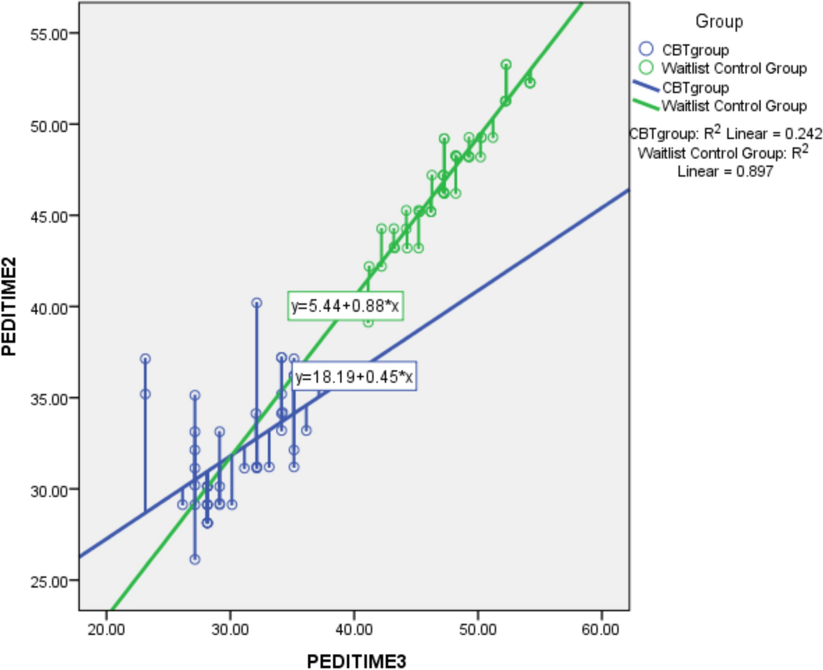 Homogeneity of Regression Slope as measured by CDS Fig. 1 which is the homogeneity slope of PEDI dataset comprised of posttest and follow-up scores. The slope of the regression line pointed in the same direction, denoting no violation of the assumption of homogeneity of regression slopes.