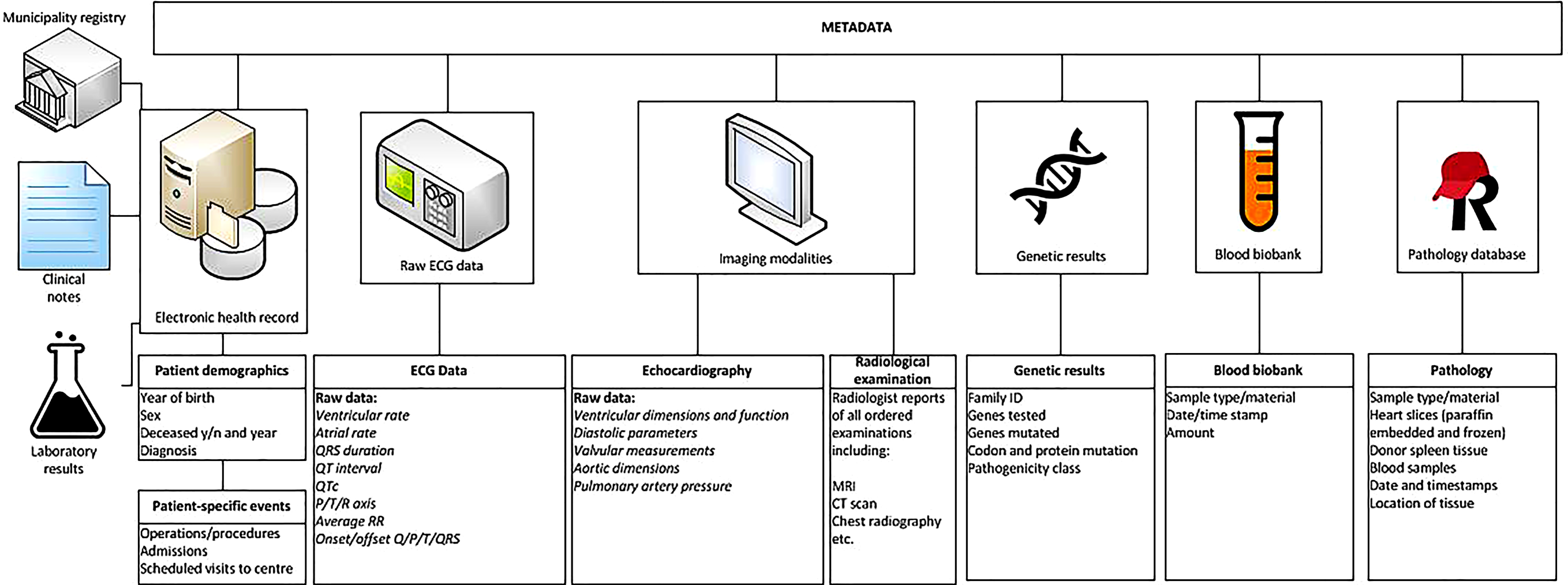 Raw data is gathered, processed and standardised for all cardiological, electrophysiological, imaging and genetic modalities (Fig. 1). On a weekly basis, these (numeric) data are automatically extracted to the RDP. Metadata is specific information describing the data (such as date of visit, type of ECG, or managing physician) which have been gathered for logistical and administrative purposes. These meta-data harbour valuable information and are also stored in the RDP. Data are viewed, combined, linked to external databases and analysed using query-based searches for data extraction using SAS Enterprise Guide (Fig. 3).