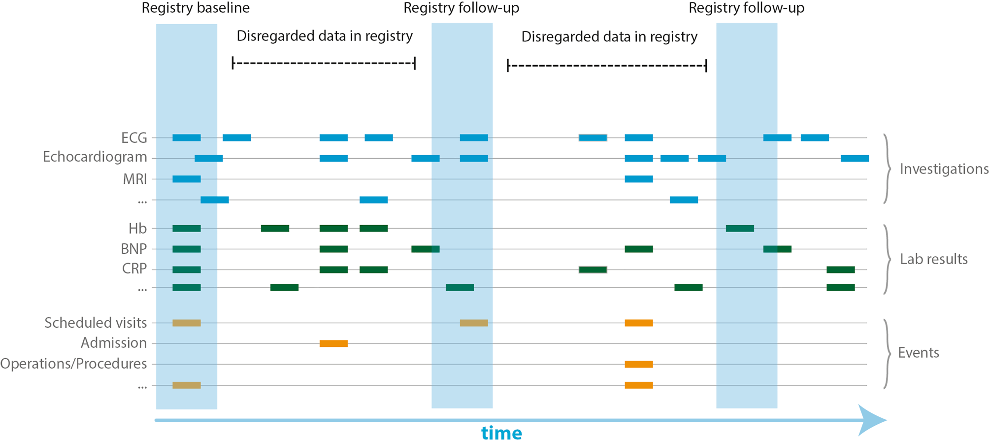 Consent is required prior to the extraction of data. Based on in-house clinical protocols, phenotyping of participants includes medical history, family history, physical examination, routine laboratory testing, 12-lead electrocardiography, chest radiography, cardiac ultrasonography, computed tomography (CT) and magnetic resonance imaging (MRI). These tests are performed at the discretion of the managing physician and have multiple time points in the EHR (Fig. 2). In contrast to manually maintained registries, all available data are captured. For example, during a visit to the in-patient clinics several electrocardiograms (ECGs) can be produced per day. Not all data might be entered into manually maintained registries, since this is a meticulous and laborious task.