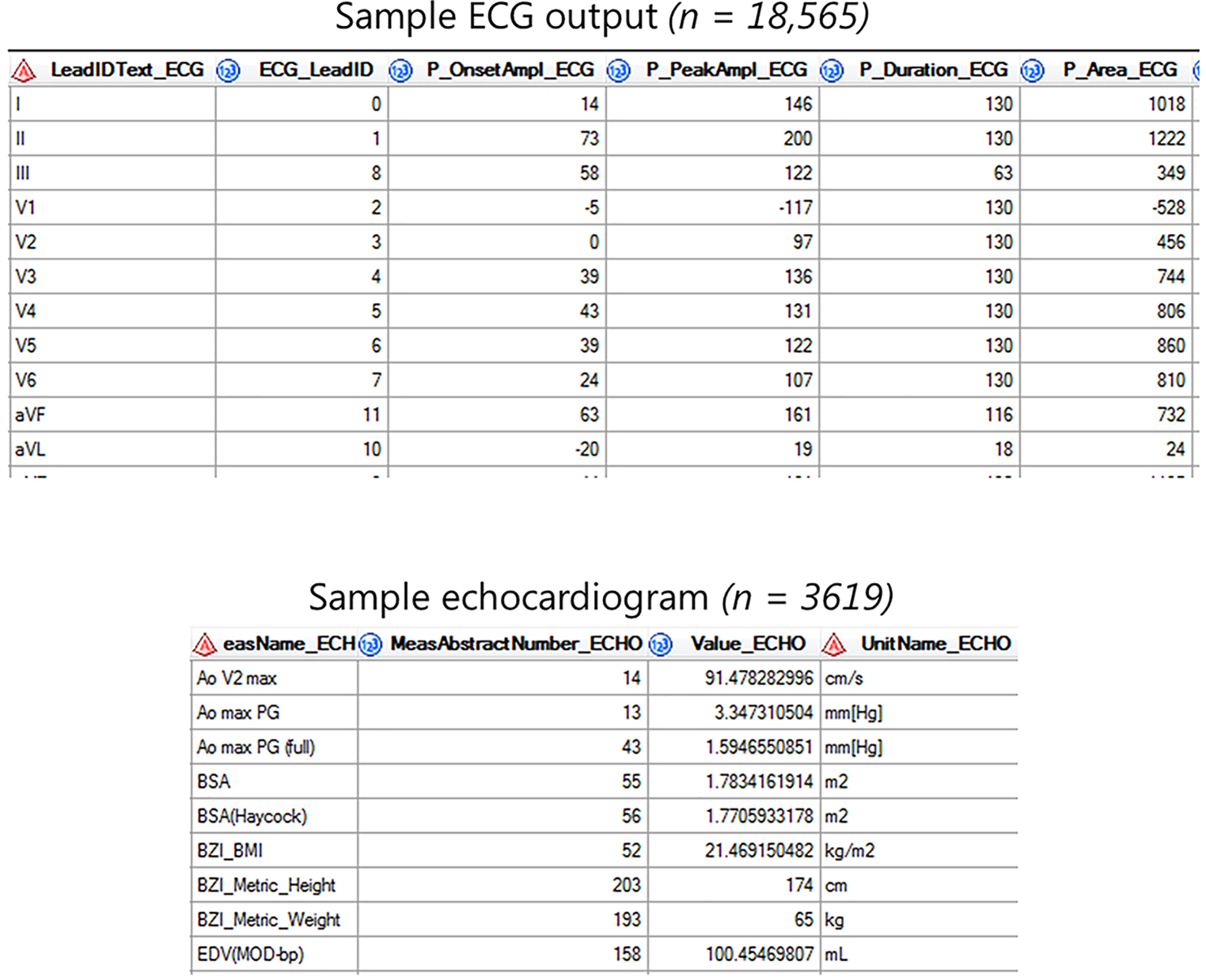 Two data tables from the UNRAVEL research data platform as samples of electrocardiogram and echocardiogram output in SAS enterprise guide. ECG electrocardiogram, ECH echocardiogram