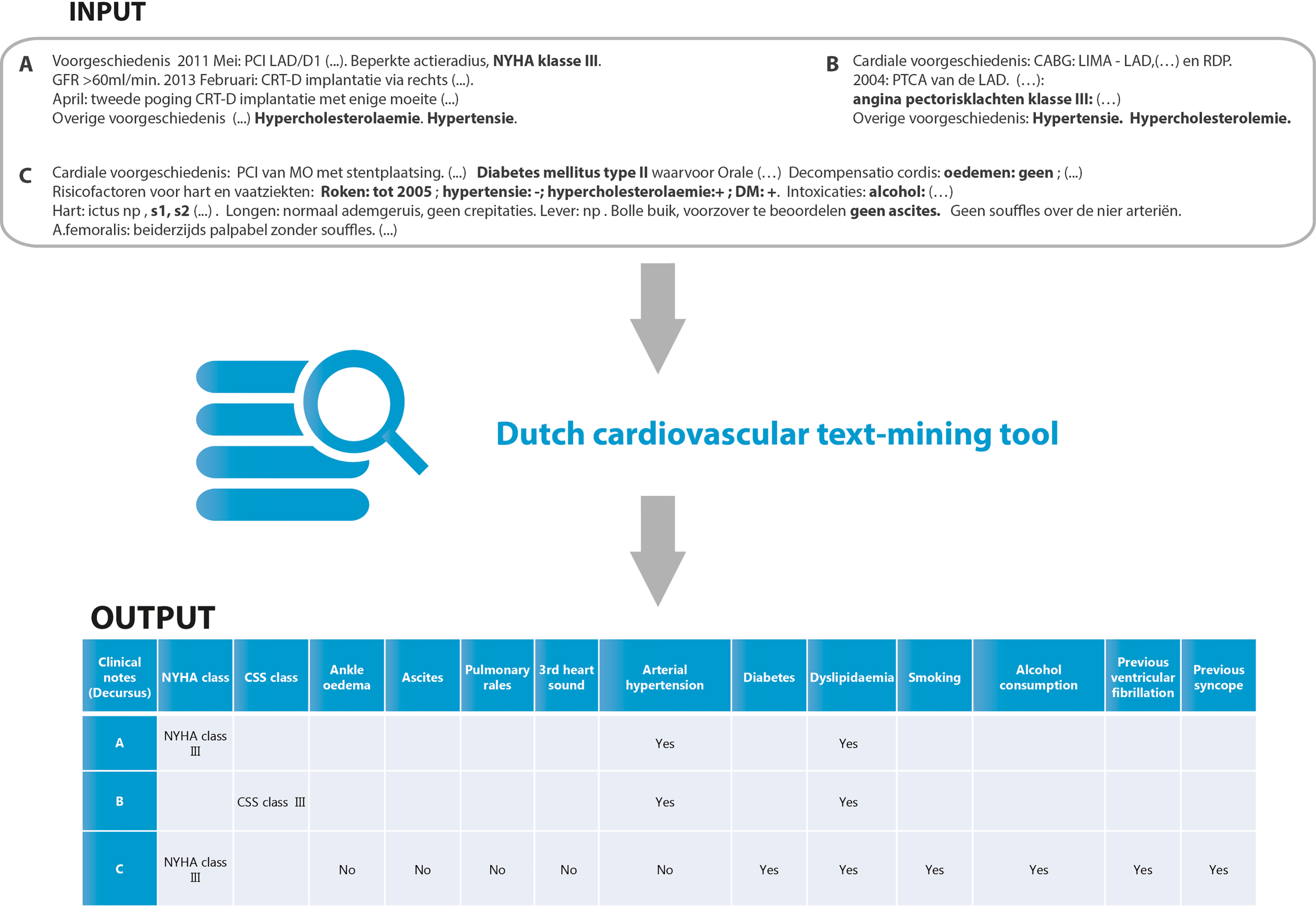 Structured EHR data such as encoded diagnosis and cardiac ultrasound are the easiest data sources to process, but advances in text mining have made it possible to also use unstructured clinical data, such as patient medical histories, discharge summaries and clinical notes [10, 14]. Using a text-retrieval algorithm, we have developed a tool to extract standardised data from clinical notes. This tool is, however, still under development and was implemented on clinical notes from the Department of Cardiology at the UMC Utrecht. Therefore, the tool should be used with caution and under the supervision of a medical expert in other centres.