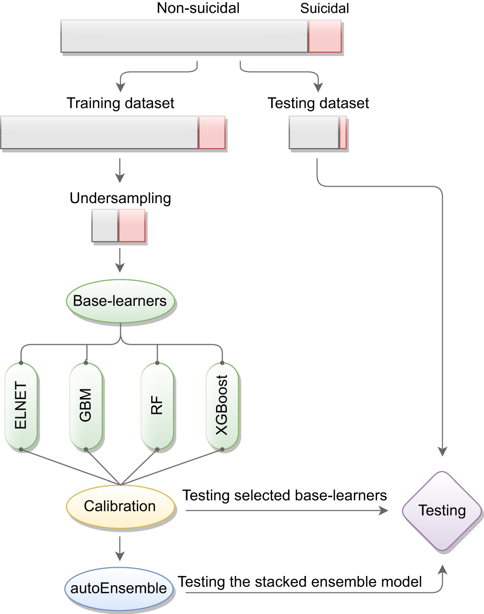 This study uses two types of supervised machine learning algorithms: base-learner algorithms and stacked ensemble algorithms. A base-learner algorithm is a single machine learning model that makes predictions based on data. A stacked ensemble algorithm (meta-learner) combines multiple base-learners to improve predictive performance by leveraging their individual strengths (Van der Laan et al., 2007). Using the h2o machine learning software version 3.37 (H2O.ai, 2023), this study trained a diverse set of base-learners including Elastic Net (ELNET), Gradient Boosting Machines (GBM), Random Forest (RF), and Extreme Gradient Boosting (XGBoost; Chen et al., 2023). To train the stacked ensemble model, the autoEnsemble R package version 0.2 (Haghish, 2023a) was employed, which specializes in building a stacked ensemble model for imbalanced outcomes, which are outcomes with low prevalence (see below). Thus, this algorithm seems suitable for classifying recent suicide attempts, which have a low prevalence in the population.