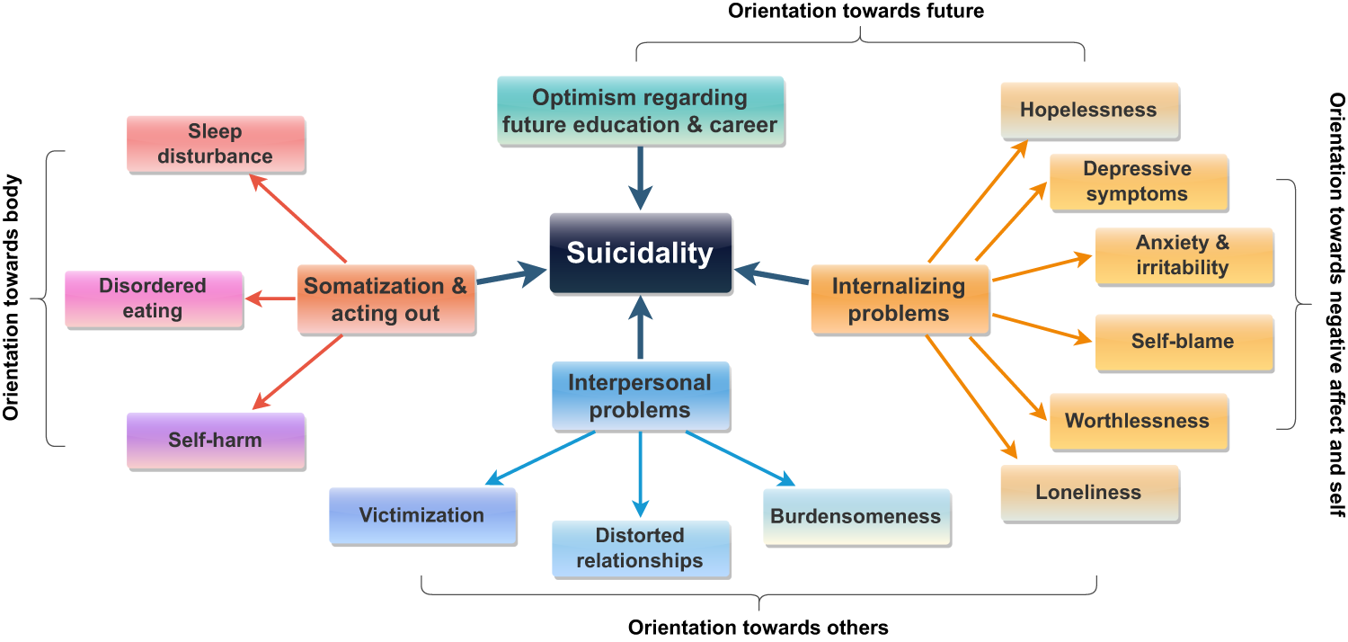 Existing empirical studies suggest that risk and protective factors for suicidal behavior can be found in societal, economic, environmental, psychological, and individual domains. But a comprehensive understanding of these factors is yet to be achieved (Hawton et al., 2012). One plausible reason is that most factors have been examined in isolation (Franklin et al., 2017). Studies that have aimed to be more holistic tend to compare individually studied factors in an additive manner while neglecting their interaction, overlap, or unique contributions to suicide risk, thus providing an incomplete picture (see for instance, Carballo et al., 2020). Indeed, meta-analyses investigating multiple risk factors for suicide attempts have revealed weak associations, casting doubt on the utility of risk factors studied in isolation with respect to actually predicting and preventing suicide attempts (Bentley et al., 2016; Ribeiro et al., 2016, 2018). Failing to consider the interconnectedness of risk and protective factors is likely to result in oversimplified understandings of their mechanisms and to misdirect research and clinical practice (Rothenberg et al., 2023). In sum, there is an urgent need for rigorous holistic analysis to better understand both risk and protective factors of suicidal behavior.