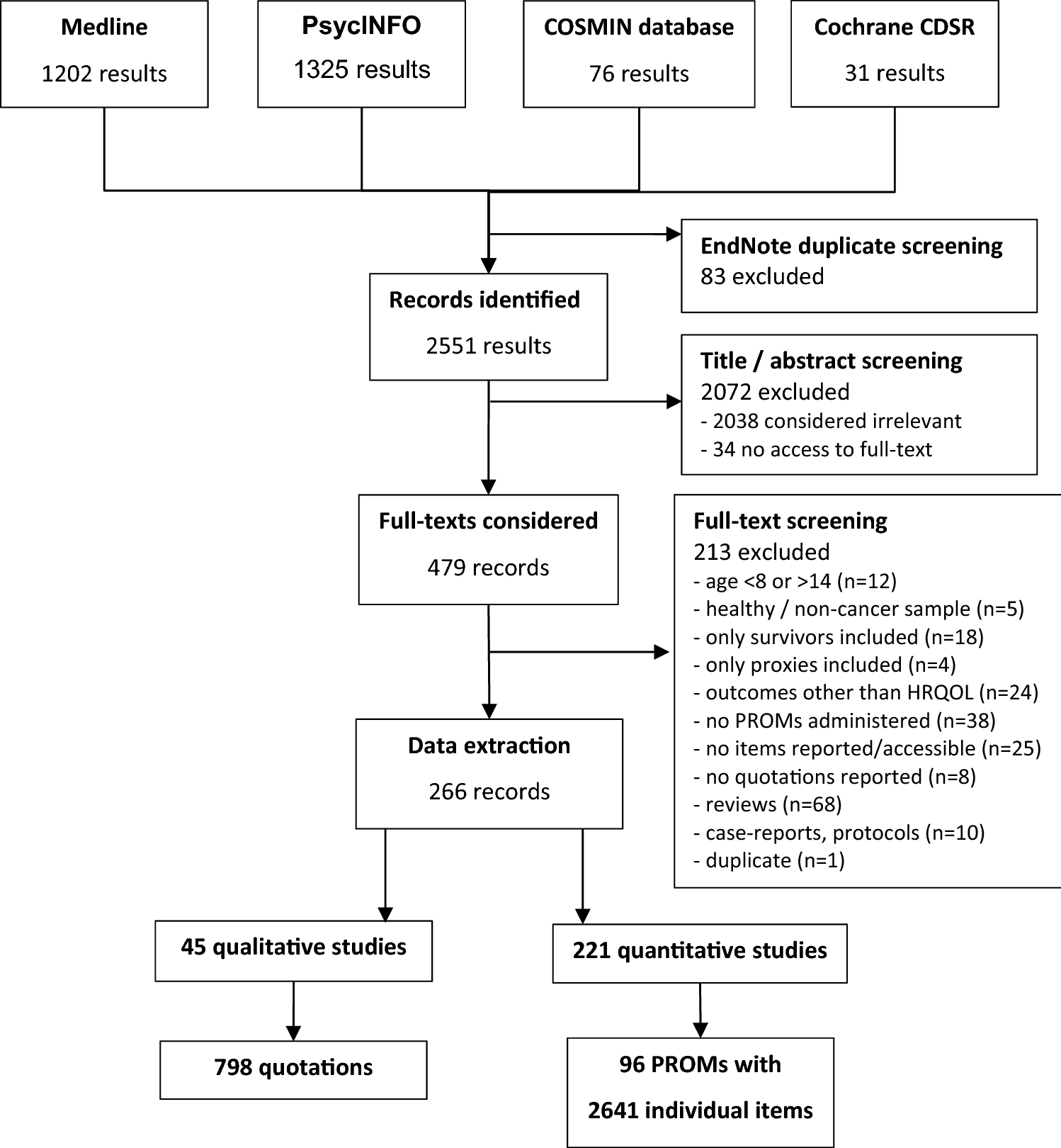 The initial literature search resulted in a total of 2551 hits. After the removal of 83 duplicates, another 2038 studies were excluded based on their title or abstract and 34 studies were excluded because full texts were not accessible. During the full-text screening of the remaining 479 studies, another 213 studies were excluded, resulting in a total of 266 studies which were included in the analysis. Among them were 221 quantitative studies using 96 different PROMs and 45 qualitative studies. For details refer to Fig. 1.