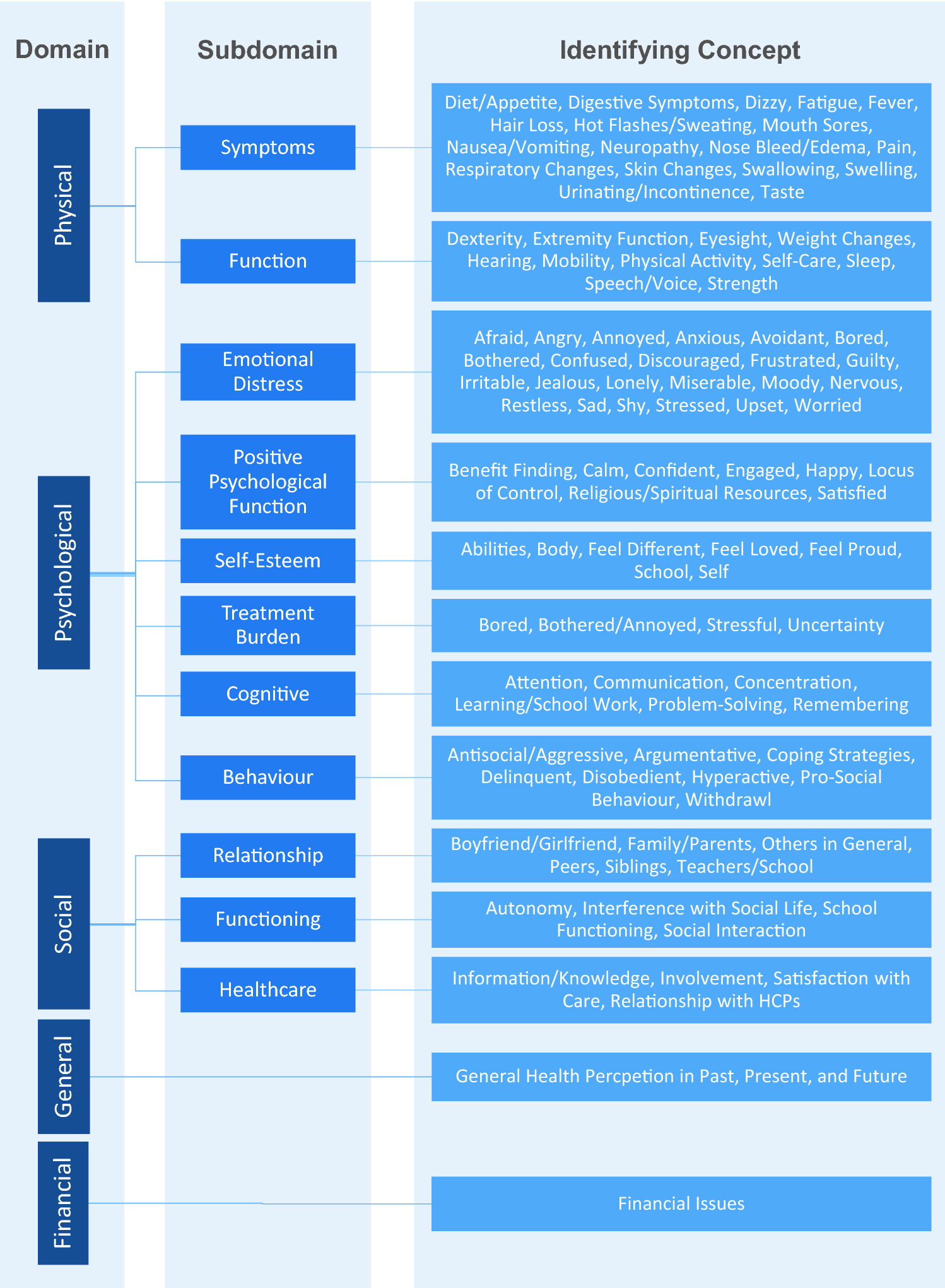 The most comprehensive conceptual framework for HRQOL in children with cancer so far has been presented by Anthony et al. [25]. In their systematic review, they identified four major HRQOL domains: physical health covers physical functioning and symptoms, while the psychological domain encompasses emotional distress, positive psychological functioning, self-esteem, body image, behavior, and cognitive health. The social domain contains social functioning and relationships, and a general health domain covers the general perception and appraisal of the health status.