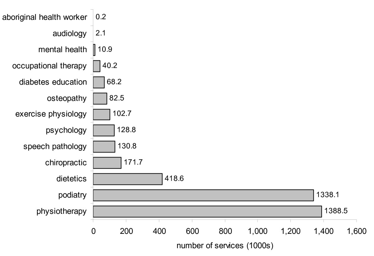 Management of chronic disease accounts for a considerable degree of healthcare expenditure in Australia, with recent data indicating that chronic medical conditions are responsible for more than 80% of the total burden of disease and injury [1]. In 1999, the Australian Government introduced the Enhanced Primary Care (EPC) program to improve the coordination of health care for people with chronic and complex conditions [2]. As part of an extension and redevelopment of this scheme, chronic disease management items were added to Medicare in 2004, enabling rebates to be paid for individual services provided by allied health professionals, including aboriginal health worker services, audiology, mental health services, psychology, occupational therapy, diabetes education, osteopathy, exercise physiology, speech pathology, chiropractic, dietetics, physiotherapy and podiatry [3].