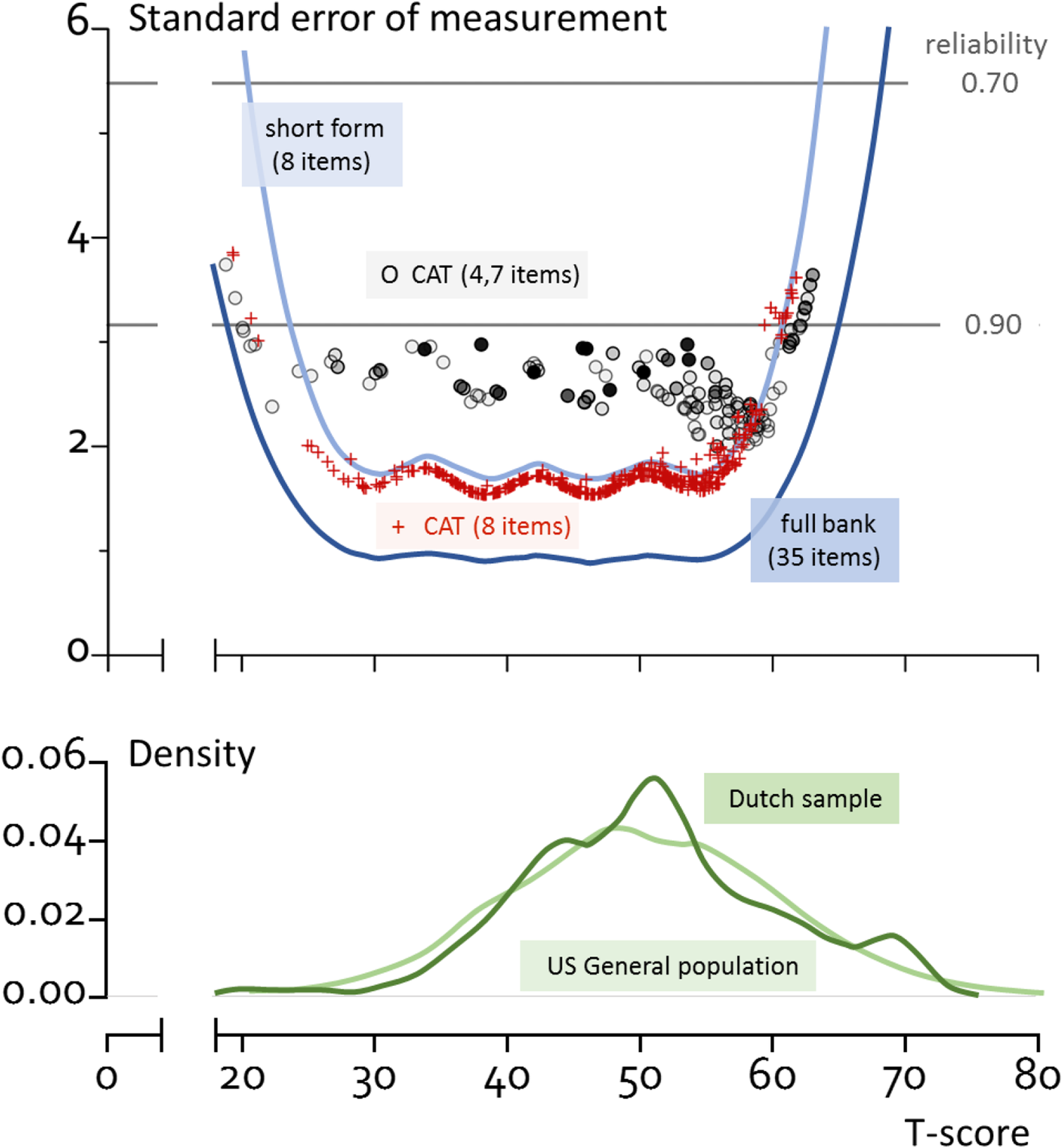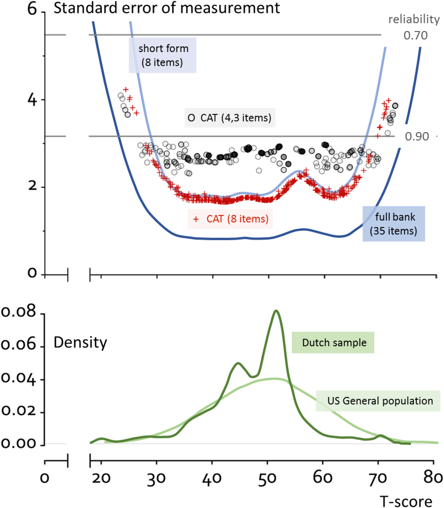 Figure 2 shows the standard error across T-scores for the full item bank, the short form, and the two simulated CATs. The full item bank (44 items) had a reliability of > 0.90 for 97% of the participants. The short form (8 items) had a reliability of > 0.90 for 95% of the participants. Using the standard CAT with SE = 3 and max 12 items, a reliability of > 0.90 was obtained for 94% of the participants with an average of 4.3 (range 3–12) items. Using a fixed 8-item CAT, a reliability of > 0.90 was obtained for 93% of the participants.