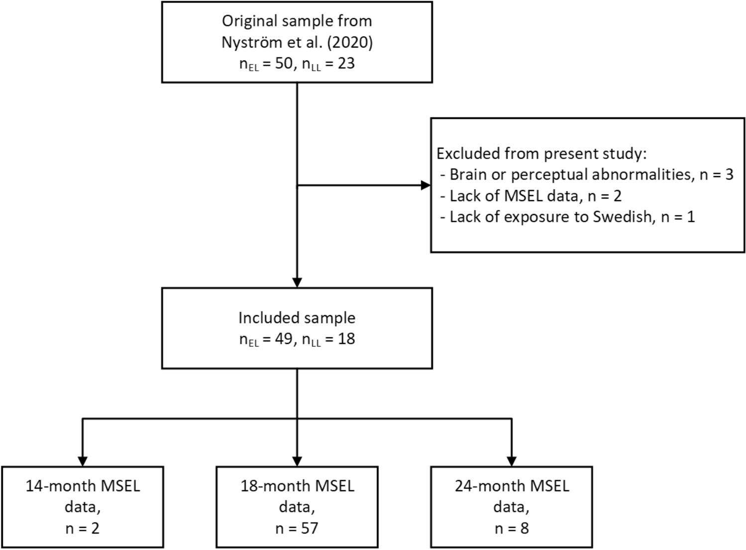 As previously described in Nyström et al. (2021), the participating families were recruited within the Early Autism Sweden (EASE) project (Falck-Ytter et al., 2018). The original sample included in the Nyström et al. (2021) study were 50 infants with elevated likelihood (EL), and 23 infants with low likelihood (LL) for ASD (Fig. 1). All infants in the EL group had at least one older sibling diagnosed with autism, while those in the LL group had no first- or second-degree relatives with such a diagnosis. For the present study, six children were excluded due to (i) documented brain or perceptual abnormalities (periventricular leukomalacia: n = 1; hearing loss: n = 1; visual impairment: n = 1), (ii) lack of data from the Mullen Scales of Early Learning (MSEL; Mullen, 1995; n = 2), and (iii) lack of exposure to the Swedish language (n = 1). Thus, the final sample in the present study included 67 infants, with 49 participating in the EL group, and 18 in the LL group. For 10 of the included children, 18 months MSEL data were missing. In these cases, we used MSEL data from the latest available time point. For eight children (El n = 7; LL n = 1), the latest time point was 24 months, and for two LL children it was 14 months. Table 1 displays participant characteristics for the final sample of children included in the analyses.