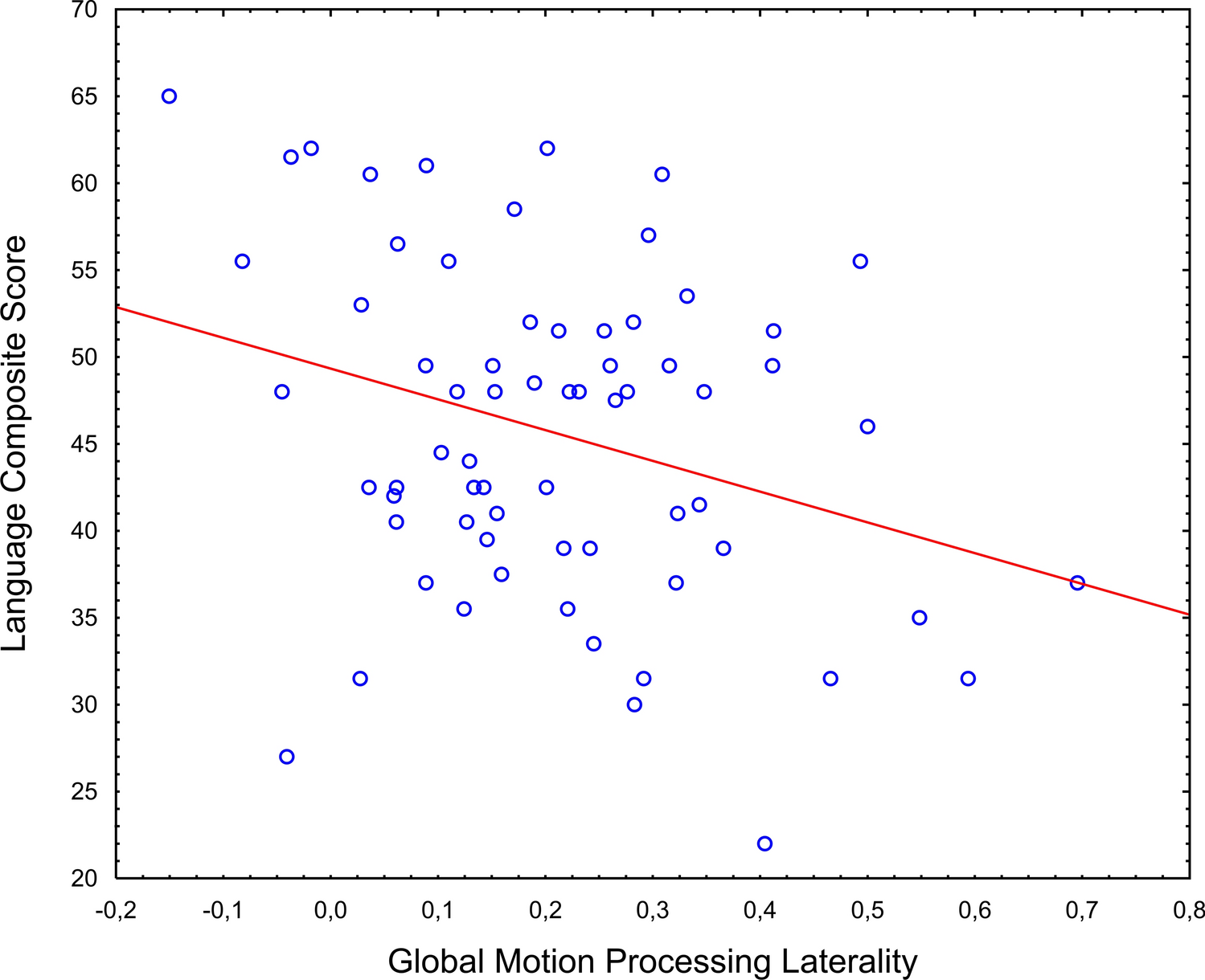 The regression analysis with GMP and GFP laterality as independent variables and the mean T-score of the receptive and expressive language subscales as the dependent variable revealed a significant effect of GMP laterality (F[1, 64] = 6.51, p = 0.013, \(\eta_\rho^2\) = 0.092, see Fig. 2) and no effect of GFP laterality (F[1,64] = 0.626, p = 0.432, \(\eta_\rho^2\) = 0.010). The main effect of GMP laterality remained significant when group and sex were added to the model (F[1, 56] = 4.20, p = 0.045, \(\eta_\rho^2\) = 0.070). No other main effects or interactions were significant (all ps > . 105).