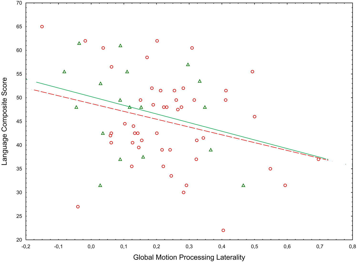 Scatterplot of GMP laterality against MSEL language composite score displayed by group. Note Circles represent the children with elevated likelihood of ASD (EL) and triangles represent the children with low likelihood of ASD (LL). The dotted line depicts the regression for the EL group and the solid line depicts the regression line for the LL group. Separate regression lines are provided for descriptive purposes only. Statistically, group did not moderate the association between Global Motion Processing Laterality and the Language Composite Score.