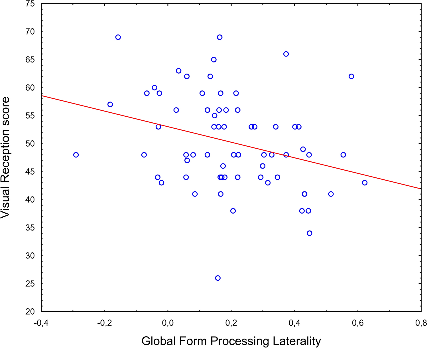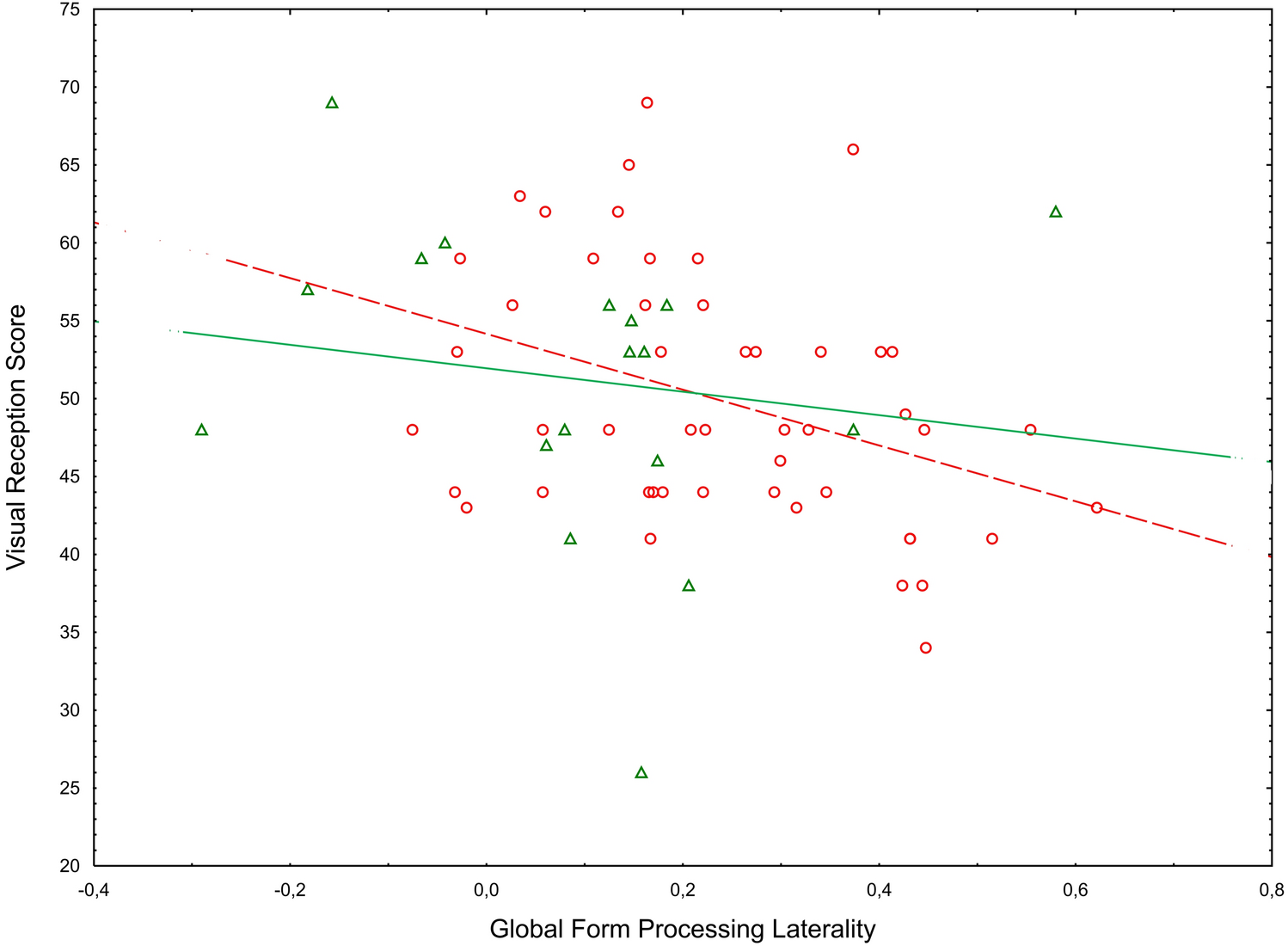 The regression analysis with GMP and GFP laterality as independent variables and the visual reception T- score as the dependent variable produced a significant effect of GFP laterality (F[1,64] = 6.58, p = 0.013, \(\eta_\rho^2\) = 0.093, Figs. 4 and 5). The effect of GMP laterality was not significant (F[1, 64] = 0.02 p = 0.871). The significant association between GFP laterality and visual reception skill held also when group and sex were added to the model (F[1, 56] = 8.37, p = 0.005, \(\eta_\rho^2\) = 0.130). No other significant main effects or interactions were observed (all ps = 0.071).