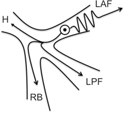 Mechanism of QRS complex by a fascicular ectopic depolarization. The speed of conduction of the impulse is delayed anterogradely over a diseased LAF. A normal speed of conduction occurs through the LPF and RB over a longer distance towards the ventricular myocardium. When both conduction times are equal, the result is a nearly synchronous activation of right and left ventricle. (H common His bundle, LAF left anterior fascicle, LPF left posterior fascicle, RB right bundle)