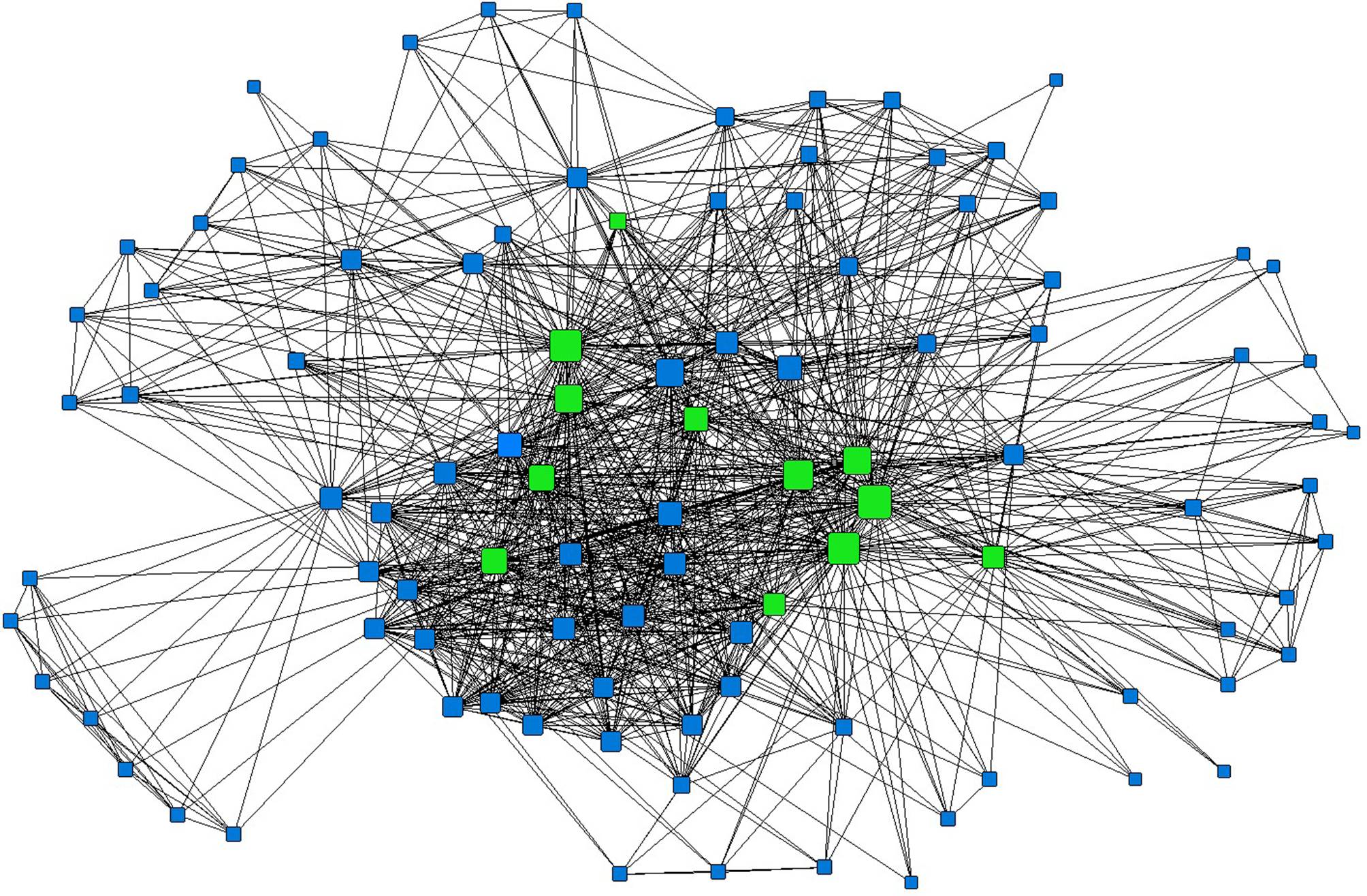 Sociale netwerkanalyse van de organisaties die samenwerken in een of meer initiatieven van het netwerk. De groene blokken representeren organisaties die bij het subregionale bestuurlijk netwerk zijn betrokken, dat al ruim voor de invoering van het IZA bestond (dat wil zeggen de casus van dit onderzoek). De blauwe blokken representeren organisaties die alleen bij (een) deelnetwerk(en) of project(en) zijn betrokken