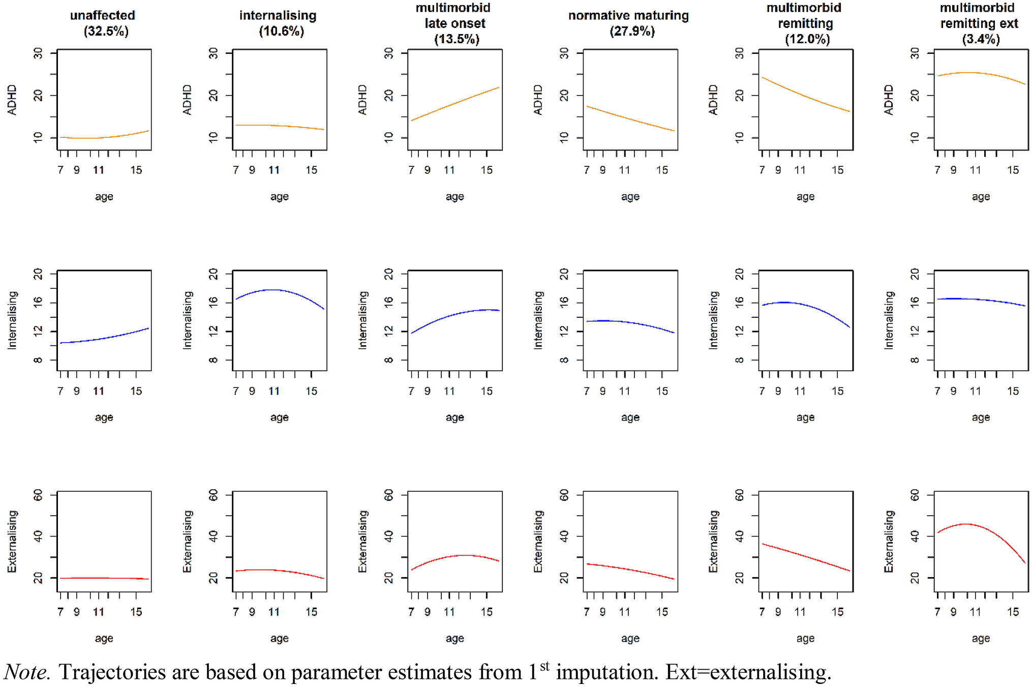 Murray et al. [23], therefore, used the recently developed group-based multi-trajectory model [33] to explore developmental subtypes defined by joint internalising, externalising, and ADHD trajectories across ages 7–15 in the z-proso study [34]. They fit a series of models with differing numbers of groups and concluded that the optimal model was one with six trajectory groups, which they labelled ‘unaffected’, ‘normative maturing’, ‘internalising’, ‘multimorbid late onset’, ‘multimorbid remitting’, and ‘multimorbid with remitting externalising’. These groups are presented in Fig. 1. Reflecting the normative nature of the sample, most participants belonged to one of two groups that were minimally affected by symptoms, i.e., the ‘unaffected’ or ‘normative maturing’ group. The ‘unaffected’ group (32.5% of the sample) showed consistently low levels of all of ADHD symptoms, externalising problems, and internalising problems. The ‘normative maturing group’ (27.9% of the sample) showed an initial elevation of problems in all three domains but the elevation was slight and symptoms declined to reach low levels by mid-adolescence. Like the ‘unaffected’ group, this group was interpreted as not showing concerning levels of problems because it is reasonably common for childhood to ‘mature out of’ elevations in issue such as conduct problems and hyperactivity [35, 36]. There were then four groups showing some elevation of symptoms in at least one domain at some stage of development. The ‘multimorbid late onset’ group (13.5% of the sample) showed initially low levels of symptoms but an escalating trajectory such that they were showing high levels of symptoms by adolescence. The ‘multimorbid remitting’ (12% of the sample) showed the opposite pattern with initially high levels of symptoms in all three domains but with a decline over development. The ‘multimorbid with remitting externalising problems’ group (3.4% of the sample) showed elevated symptoms in all three domains but with a rapid reduction in externalising problems around the transition to adolescence. ADHD symptoms and internalising problems; however, remained stably high for this group. Finally, a (pure) ‘internalising’ trajectory was identified (10.6% of the sample), characterised by stably high levels of symptoms in the internalising problems domain only. The authors noted that most of the developmental subtypes that emerged from the data were characterised by developmental trajectories that tracked each other closely across the three domains (except in the ‘pure internalising’ trajectory, further underlining the tendency for these three domains to show co-occurrence.