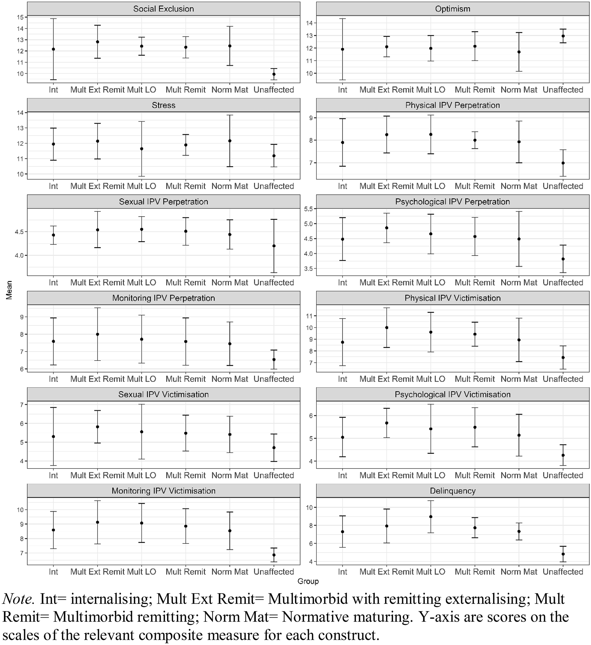 Intimate partner violence perpetration was measured by self-report at age 20 with a parallel set of items, worded identically to the perpetration items, except for the fact that they referred to the respondents’ perpetration rather than victimisation experiences. Items from each subscale were summed to form composite Physical IPV victimisation, Sexual IPV perpetration, Psychological IPV victimisation and Monitoring IPV victimisation scores. Omega reliability scores were: 0.76 for physical IPV perpetration; 0.60 for sexual IPV perpetration; and 0.81 for monitoring IPV perpetration.