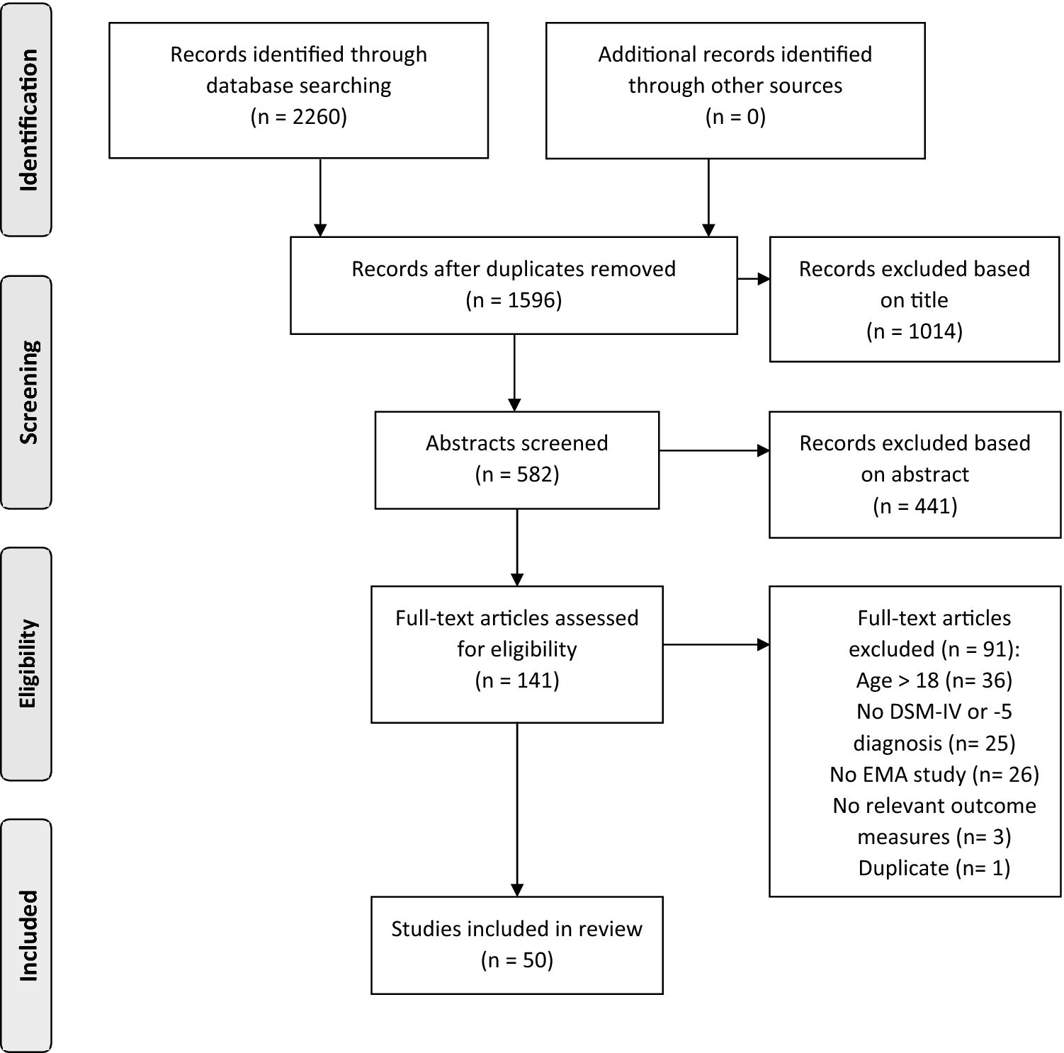 Given our first aim of reviewing the characteristics of EMA applications, we retrieved and reviewed data referring to the study sample (participants, age range, and DSM diagnosis of patient group, and, when applicable, participants and description of comparison groups) and the EMA procedures (format, contingency, completed by whom, observations per day, days, sum of observations, and outcome variables). Given our second aim of synthesizing the potential of applying EMA, we formed a narrative review of the data on EMA applications and relevant empirical data according to one of the three sub-topics. First, we summarized studies that specifically examined feasibility and validity, plus a synthesis on compliance with EMA measures. Second, we grouped studies that investigated the phenomenology of youth psychopathology. Third, we identified all treatment studies. Due to the large number of studies within the topic of phenomenology, this topic was organized per DSM section.